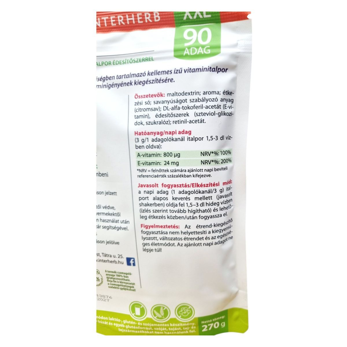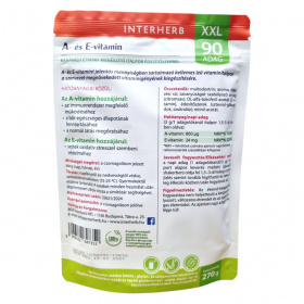 Az INTERHERB XXL banánízű italpor egy kellemes ízű étrend-kiegészítő, amely A- és E-vitamint tartalmaz. Az A-vitamin hozzájárulhat az immunrendszer megfelelő működéséhez, a bőr egészségének fenntartásához és a normál látás megőrzéséhez. Az E-vitamin segíthet a sejtek oxidatív stresszel szembeni védelmében. A termék természetes módon laktóz-, glutén- és szójamentes, így széles körben fogyasztható. A termék 270 g-os kiszerelésben kapható, és 90 adag elkészítésére elegendő. Az italpor édesítőszerrel készül, és a szervezet megnövekedett vitaminigényének kiegészítésére szolgálhat.