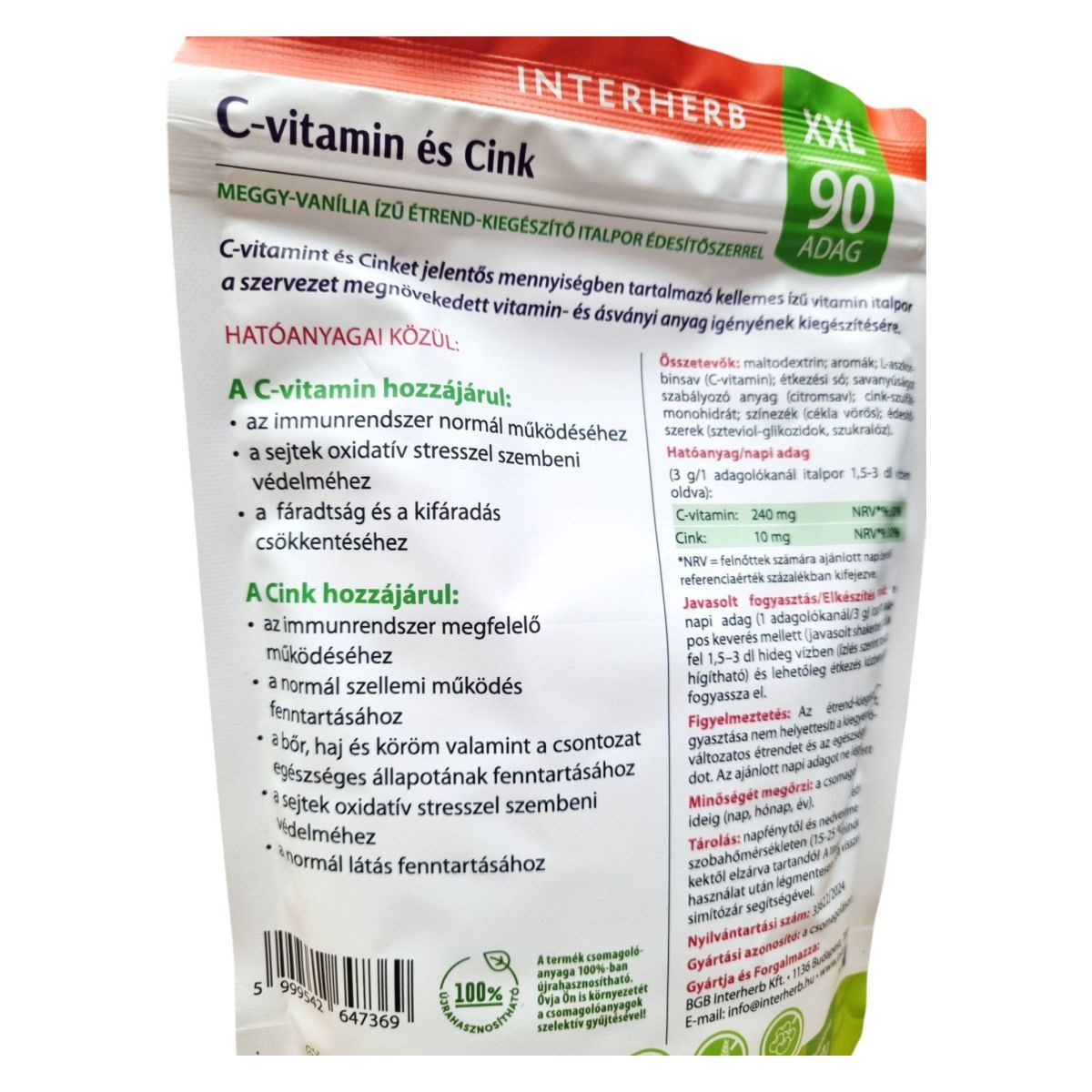 Az INTERHERB C-vitamin és Cink italpor egy meggy-vanília ízű étrend-kiegészítő, amelyet a szervezet megnövekedett vitamin- és ásványi anyag igényének kiegészítésére fejlesztettek ki. A termék jelentős mennyiségű C-vitamint és cinket tartalmaz, amelyek hozzájárulhatnak az immunrendszer normál működéséhez, a sejtek oxidatív stresszel szembeni védelméhez, valamint a fáradtság és kifáradás csökkentéséhez. A cink ezen felül támogathatja a normál szellemi működést, a bőr, haj és köröm egészséges állapotának fenntartását, valamint a normál látás fenntartását is. A termék 270 g-os kiszerelésben kapható, és 90 adag elkészítésére elegendő. A csomagolás 100%-ban újrahasznosítható, így környezetbarát választás lehet.