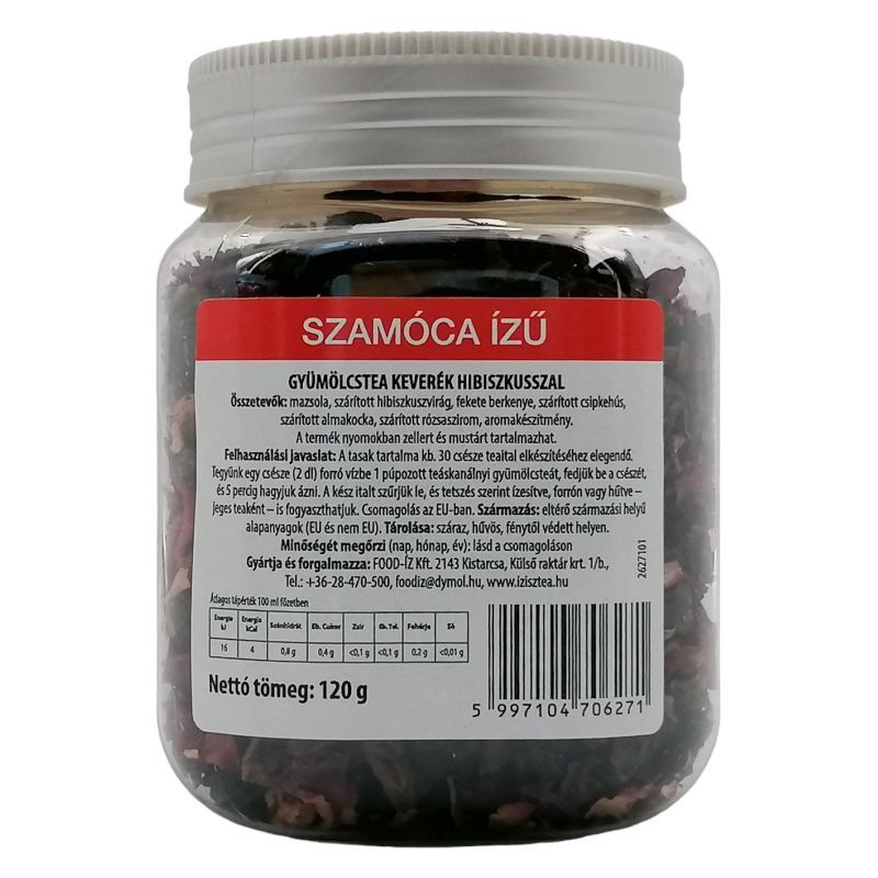 Mazsola, szárított hibiszkuszvirág, fekete berkenye, szárított csipkehús, szárított almakocka, szárított rózsaszirom, aromakészítmény. A termék nyomokban zellert és mustárt tartalmazhat. Felhasználási javaslat: A tasak tartalma kb. 30 csésze teaital elkészítéséhez elegendő. Tegyünk egy csésze (2 dl) forró vízbe 1 púpozott teáskanálnyi gyümölcsteát, fedjük be a csészét, és 5 percig hagyjuk ázni. A kész italt szűrjük le, és tetszés szerint ízesítve, forrón vagy hűtve - jeges teaként - is fogyaszthatjuk.Tárolása:száraz,hűvös,fénytől védett helyen.
