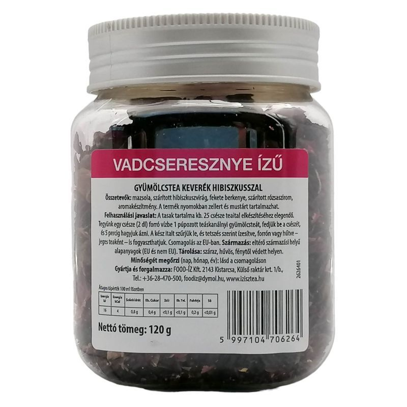 Mazsola, szárított hibiszkuszvirág, fekete berkenye, szárított rózsaszirom, aromakészítmény. A termék nyomokban zellert és mustárt tartalmazhat. Felhasználási javaslat: A tasak tartalma kb. 30 csésze teaital elkészítéséhez elegendő. Tegyünk egy csésze (2 dl) forró vízbe 1 púpozott teáskanálnyi gyümölcsteát, fedjük be a csészét, és 5 percig hagyjuk ázni. A kész italt szűrjük le, és tetszés szerint ízesítve, forrón vagy hűtve - jeges teaként - is fogyaszthatjuk.Tárolása:száraz,hűvös,fénytől védett helyen.