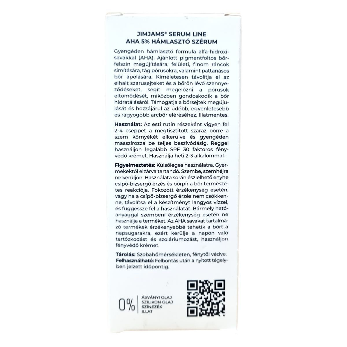 A jimjams® Serum Line AHA 5% hámlasztó szérum gyengéden távolítja el az elhalt hámsejteket és a szennyeződéseket, megakadályozva a pórusok eltömődését, miközben hidratálja a bőrt. Kifejezetten ajánlott pigmentfoltos bőr megújítására, a finom ráncok és tág pórusok kezelésére, valamint pattanásos bőr ápolására. Illatanyagmentes összetétele biztosítja a kíméletes ápolást. A termék az AHA-savaknak köszönhetően támogatja a bőrsejtek megújulását, így segít elérni az üde, egyenletes és ragyogó arcbőrt.
