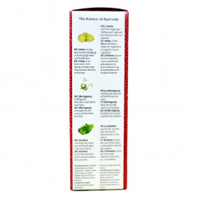 Amla – anti-aging összetevő, amely megújítja a hajat és a fejbőrt; Bhringaraj – erősíti a hajgyökereket és támogatja a hajnövekedést; Brahmi – táplálja a hajgyökereket, serkenti a haj növekedését.