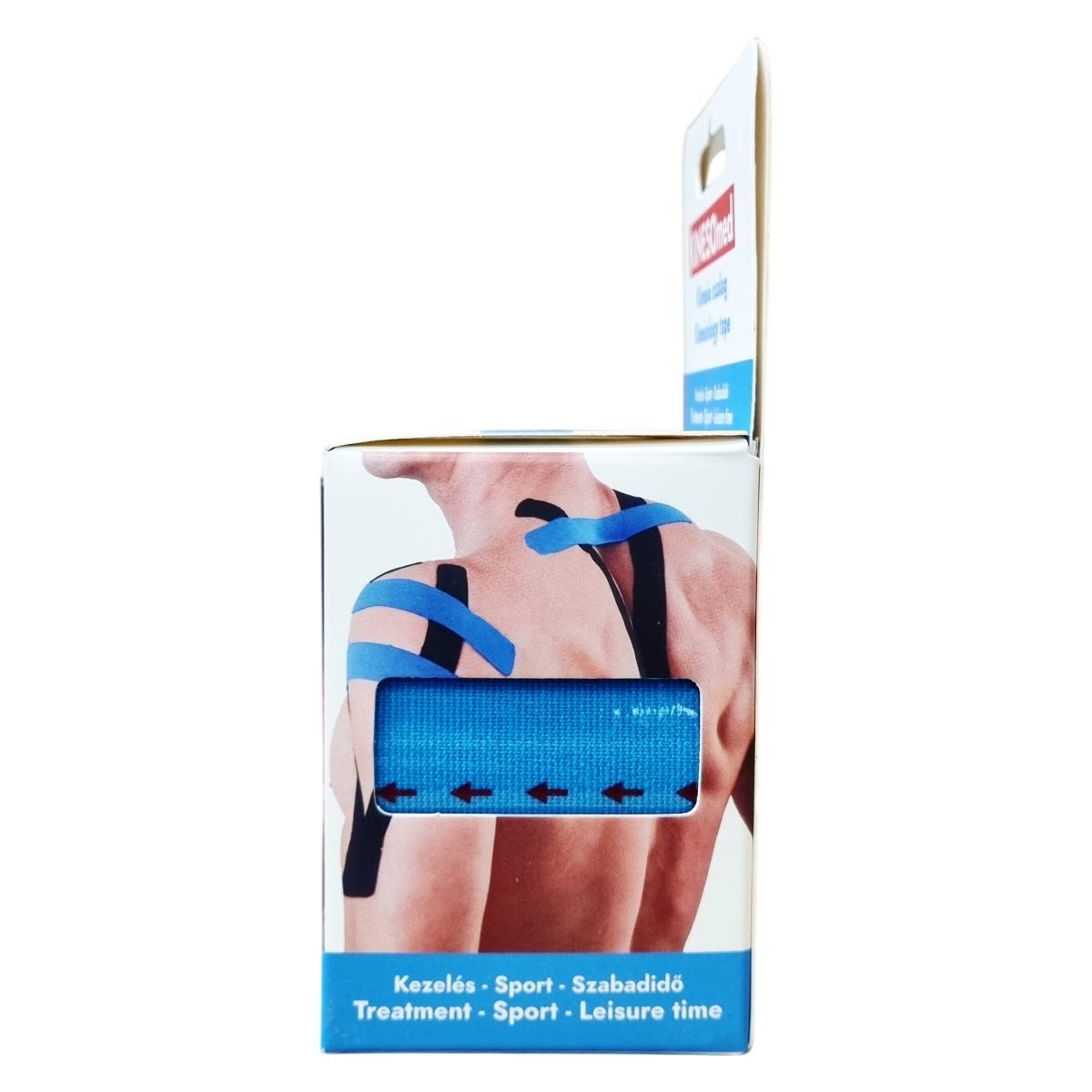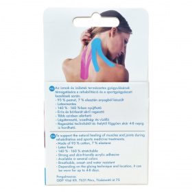 Pamutból készült, légáteresztő, vízálló, elasztikusságában az emberi bőrhöz hasonló, hosszúságában rugalmas ragasztószalag. Kék színben.