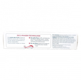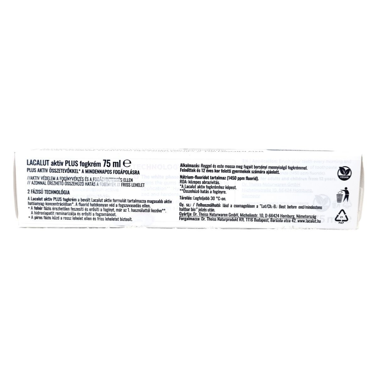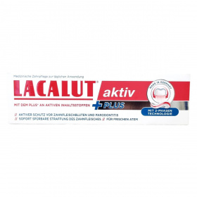 A Lacalut aktiv PLUS kétfázisú technológiával készült fogkrém, amely magasabb koncentrációban tartalmaz aktív hatóanyagokat a fogínyvédelem és a fogzománc erősítése érdekében. A fehér fázis azonnal feszesíti és erősíti a fogínyt, míg a piros fázis hatékonyan küzd a rossz lehelet ellen és friss leheletet biztosít. A termék fluoridot tartalmaz a fogszuvasodás elleni védelem érdekében, miközben a hidroxiapatit eljárással remineralizálja és keményíti a fogzománcot. Közepes abrazivitású, így mindennapi fogápolásra alkalmas felnőttek és 12 éves kor feletti gyermekek számára.