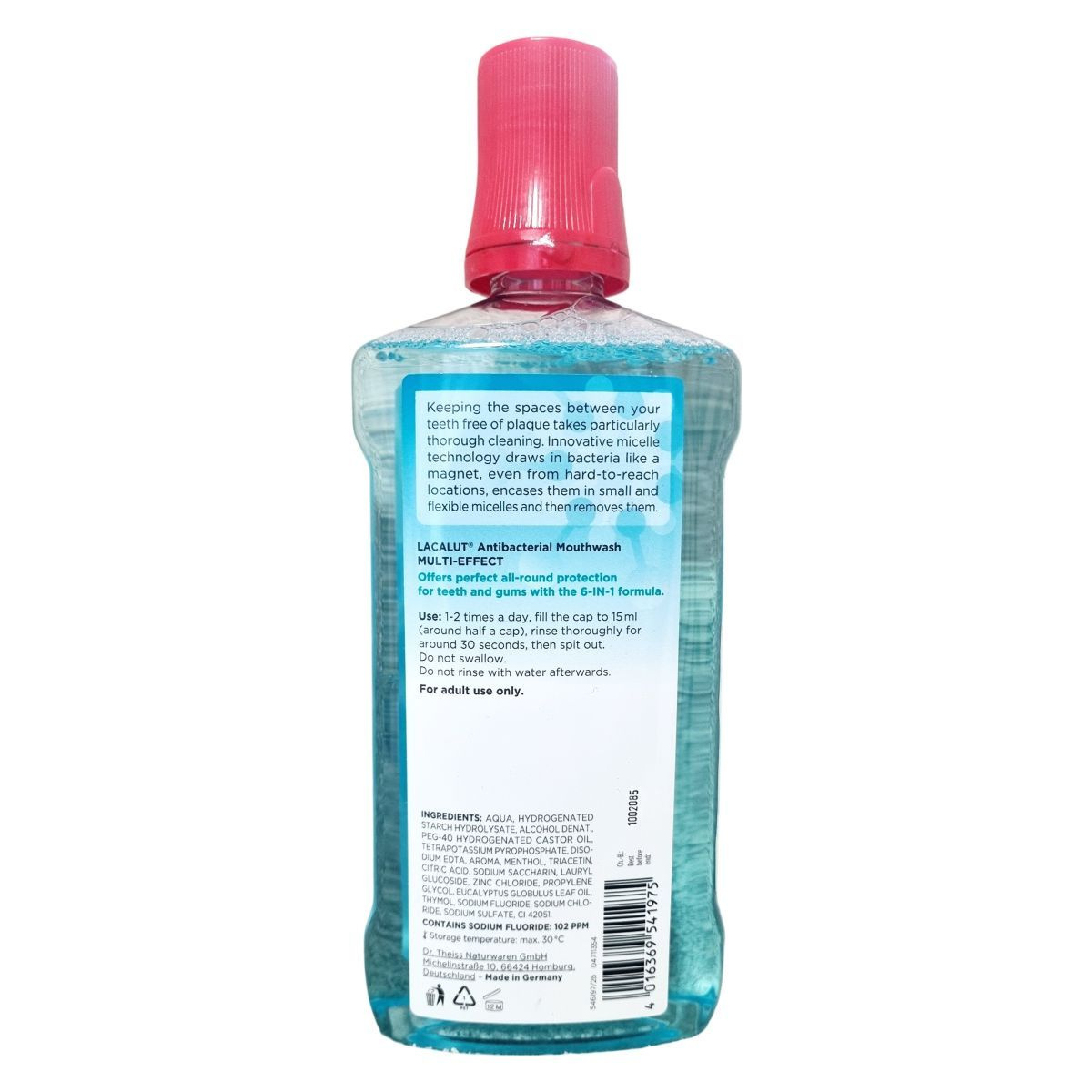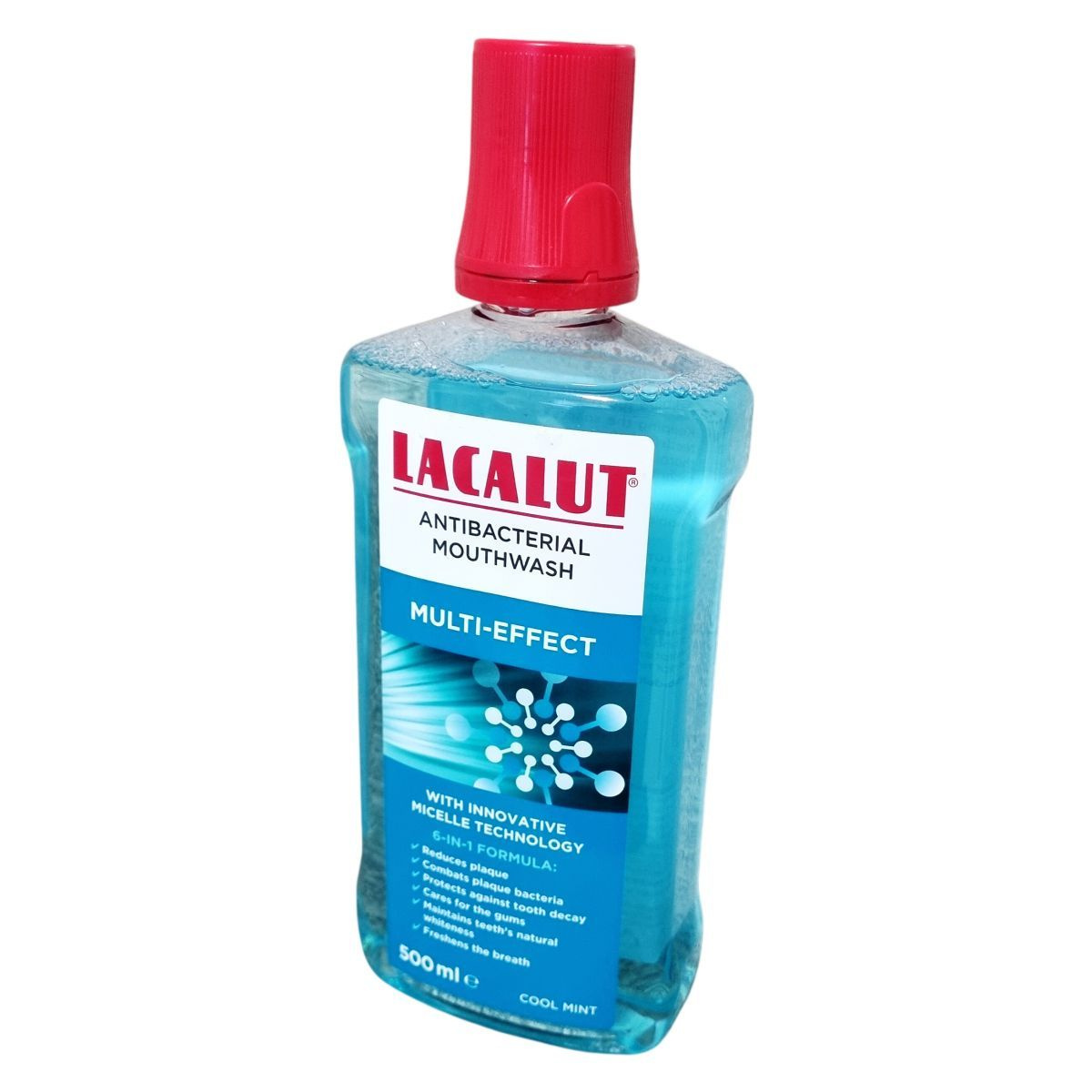 A LACALUT Antibacterial Mouthwash innovatív micella technológiával hatékonyan távolítja el a fogak közötti lepedéket, akár a nehezen elérhető területekről is. Hatékonyan csökkenti a lepedékképző baktériumokat, védi a fogakat a károsodástól, gondoskodik az íny egészségéről, megőrzi a fogak természetes fehérségét, és friss leheletet biztosít. A szájvíz 6 az 1-ben formula révén komplex védelmet nyújt a fogak és az íny számára.