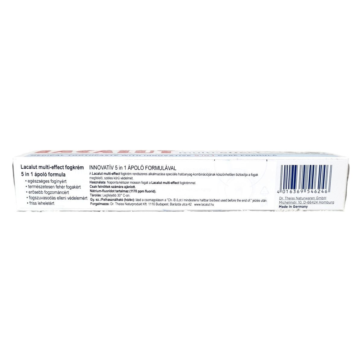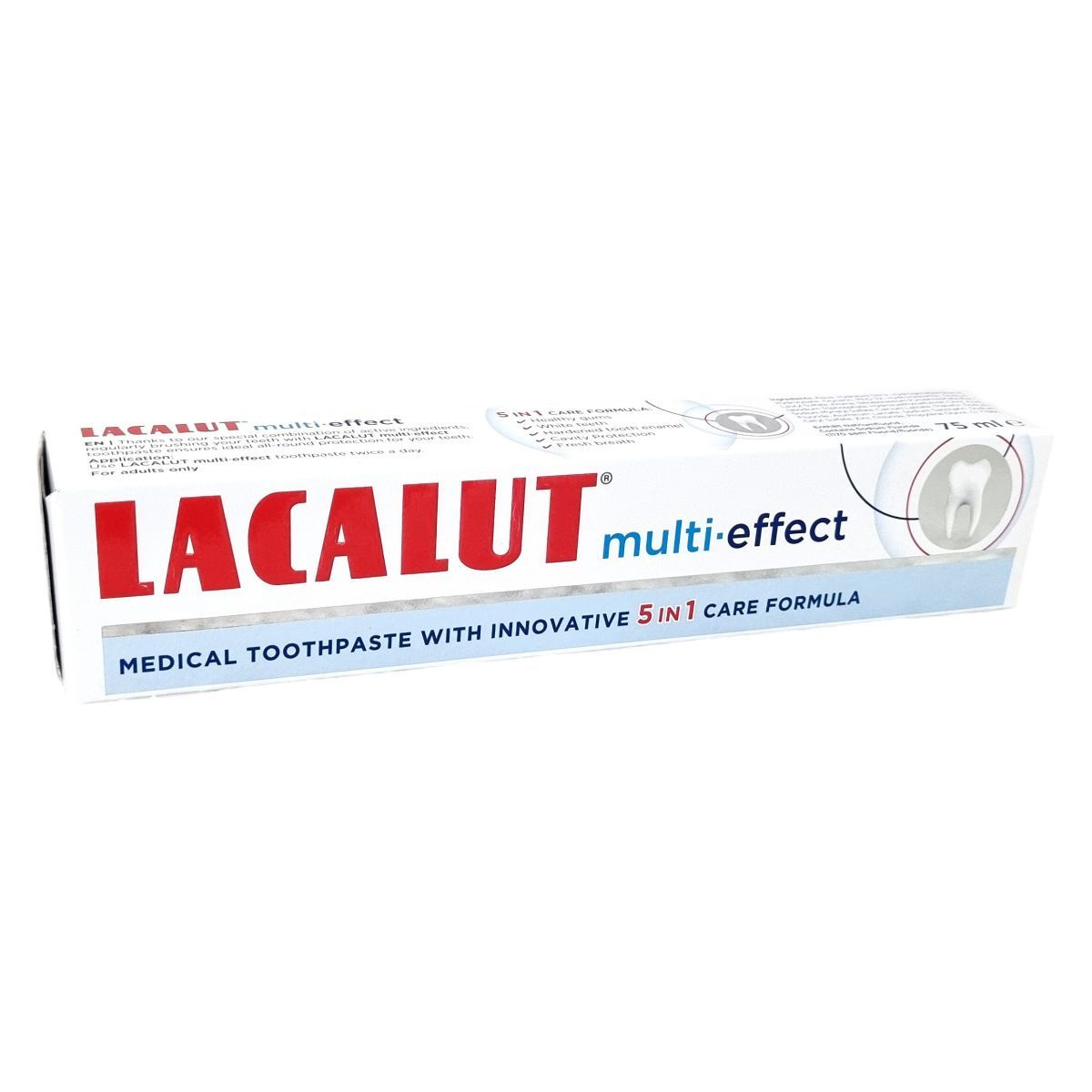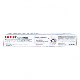 A Lacalut multi-effect fogkrém hatékony 5 az 1-ben formulával segíti elő az egészséges fogínyt, a fehér fogakat, a fogzománc erősítését, a fogszuvasodás elleni védelmet és a friss leheletet.