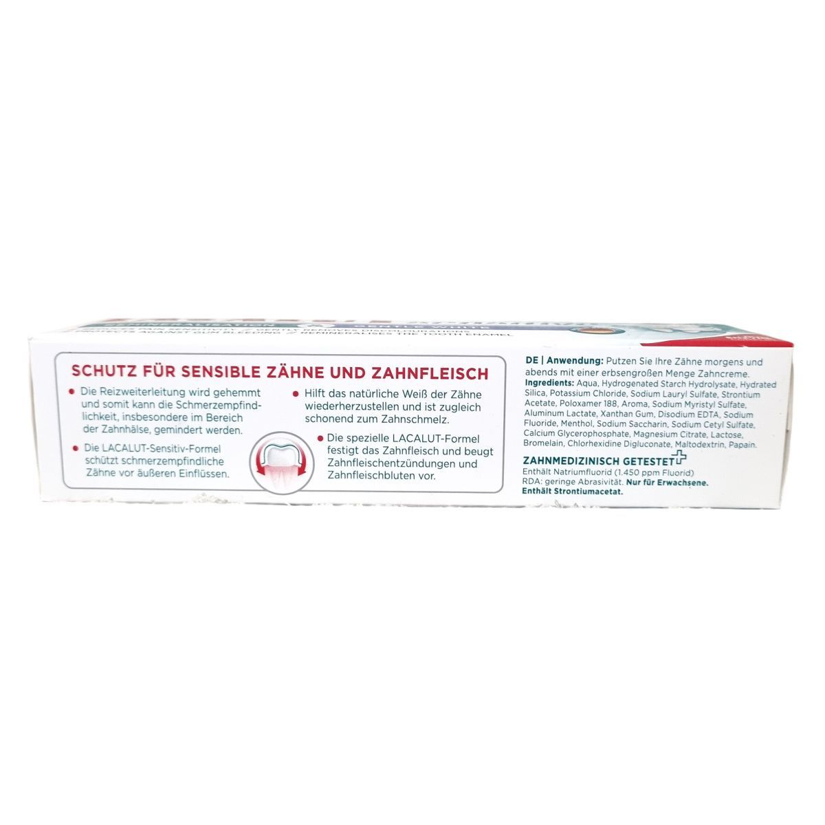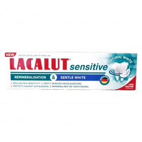 A Lacalut sensitive fogkrém orvosi célú napi fogápolásra készült, természetes fehérséget biztosít és gyengéden eltávolítja az elszíneződéseket. Hatékonyan csökkenti a fájdalomérzékenységet, különösen a fognyak területén, mivel gátolja az ingerületek továbbítását. A formula védi az érzékeny fogakat a külső behatások ellen, erősíti a fogínyt, valamint megelőzi az ínygyulladást és az ínyvérzést. Alacsony abrazivitású, így kíméletes a fogzománchoz, miközben remineralizálja azt és támogatja a fogíny egészségét. A termék DUO enzimeket tartalmaz, melyek hozzájárulnak a hatékonysághoz. Made in Germany, fogorvosok által tesztelt.