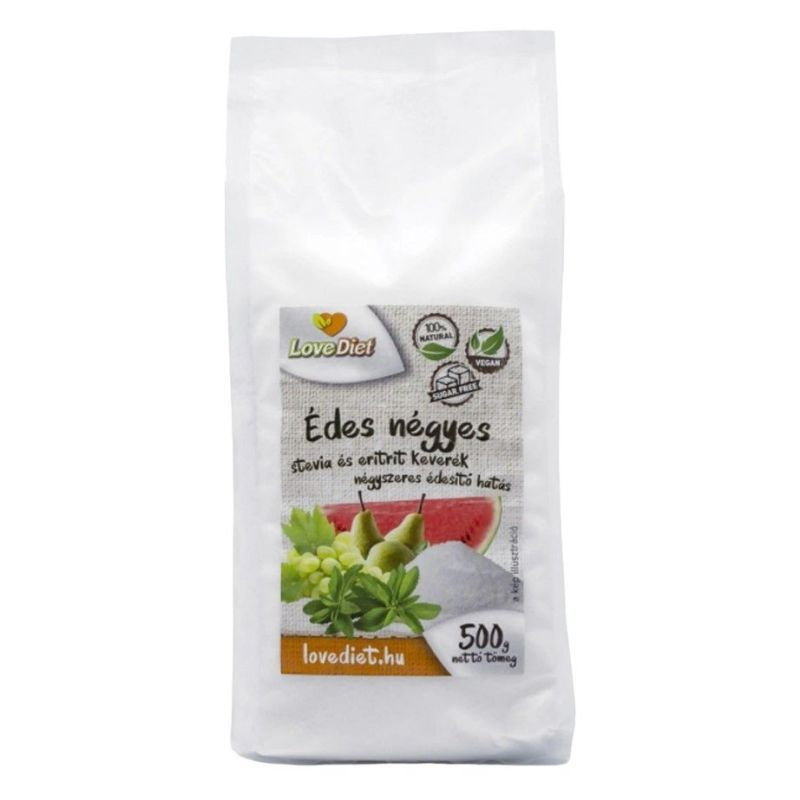 A Love Diet Édesnégyes eritrit és stevia alapú nulla kalóriás édesítőszer, mely négyszer édesebb a cukornál. Gazdaságos, sütésálló cukorhelyettesítő.