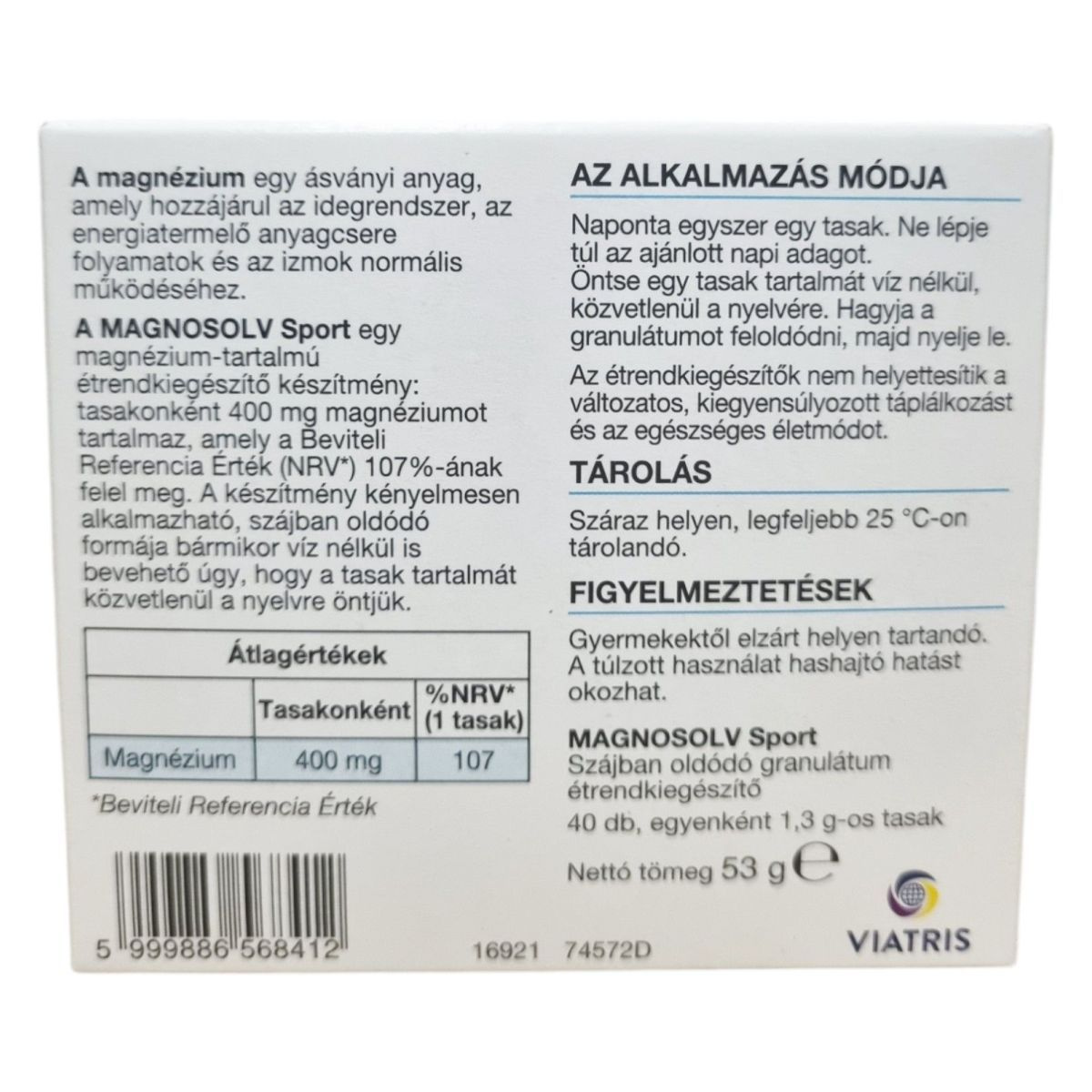 A MAGNOSOLV Sport egy kényelmesen alkalmazható, szájban oldódó granulátum formájú étrendkiegészítő, amely tasakonként 400 mg magnéziumot tartalmaz. A magnézium hozzájárulhat az idegrendszer, az energiatermelő anyagcsere-folyamatok és az izmok normális működéséhez. A termék cukormentes, narancsízű, és édesítőszereket tartalmaz. A granulátum közvetlenül a nyelvre öntve, víz nélkül is bevehető, így ideális választás lehet azok számára, akik gyors és egyszerű megoldást keresnek a magnéziumbevitelre. Az étrendkiegészítők nem helyettesítik a változatos, kiegyensúlyozott táplálkozást és az egészséges életmódot.