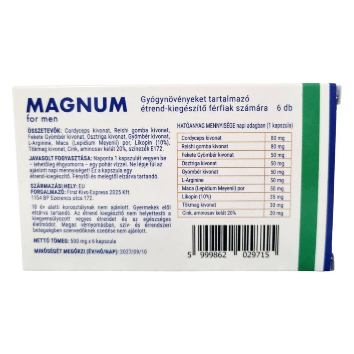 A csomag 6 db, egyenként 500 mg-os kapszulát tartalmaz. A hatóanyagok között több gombakivonat (cordyceps, reishi), fekete gyömbér, osztriga és gyömbér kivonat, továbbá L-arginin, maca por, likopin, tökmag kivonat és cink (aminosav-kelát) található. Származási hely: EU.