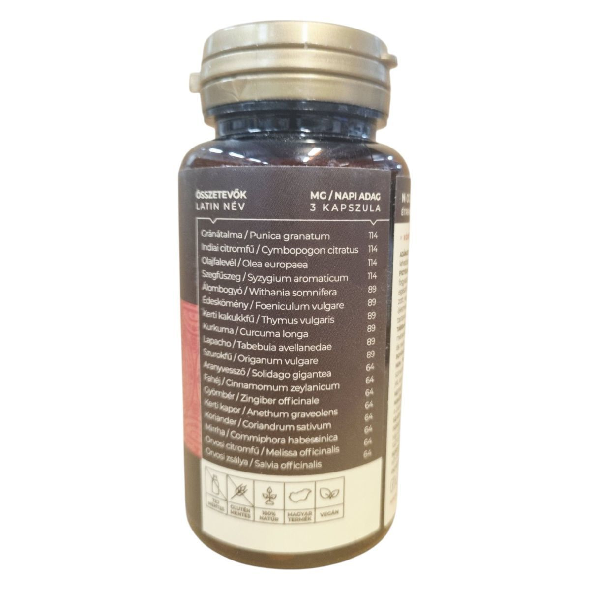 Gránátalma (Punica granatum) 114 mg, Indiai citromfű (Cymbopogon citratus) 114 mg, Olajfalevél (Olea europaea) 114 mg, Szegfűszeg (Syzygium aromaticum) 114 mg, Álombogyó (Withania somnifera) 89 mg, Fahéj (Cinnamomum zeylanicum) 64 mg, Gyömbér (Zingiber officinale) 64 mg, Kerti kapor (Anethum graveolens) 64 mg, Koriander (Coriandrum sativum) 64 mg, Mirha (Commiphora habessinica) 64 mg, Orvosi citromfű (Melissa officinalis) 64 mg, Orvosi zsálya (Salvia officinalis) 64 mg