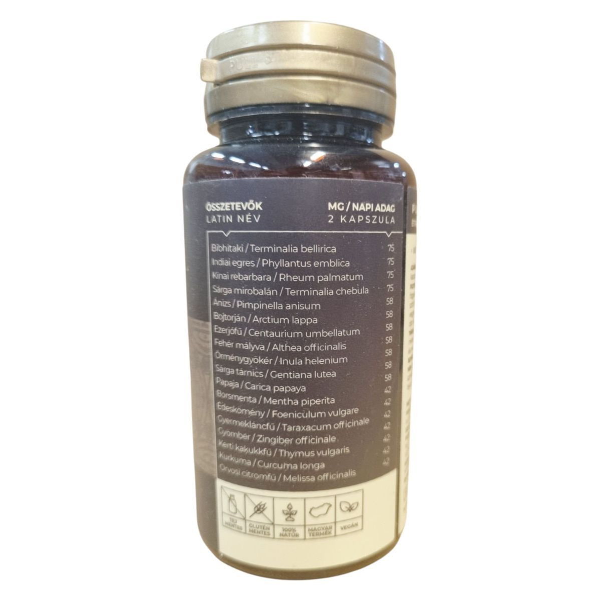 Bibhitaki (Terminalia bellirica) 75 mg, Indiai egres (Phyllantus emblica) 75 mg, Kínai rebarbara (Rheum palmatum) 75 mg, Sárga mirobalán (Terminalia chebula) 58 mg, Bojtorján (Arctium lappa) 58 mg, Ezerjófű (Centaurium umbellatum) 58 mg, Fehér mályva (Althea officinalis) 58 mg, Örménygyökér (Inula helenium) 58 mg, Sárga tárnics (Gentiana lutea) 58 mg, Papaja (Carica papaya) 42 mg, Borsmenta (Mentha piperita) 42 mg, Édeskömény (Foeniculum vulgare) 42 mg, Gyermekláncfű (Taraxacum officinale) 42 mg, Gyömbér (Zingiber officinale) 42 mg, Kerti kakukkfű (Thymus vulgaris) 42 mg, Kurkuma (Curcuma longa) 42 mg, Orvosi citromfű (Melissa officinalis) 42 mg.