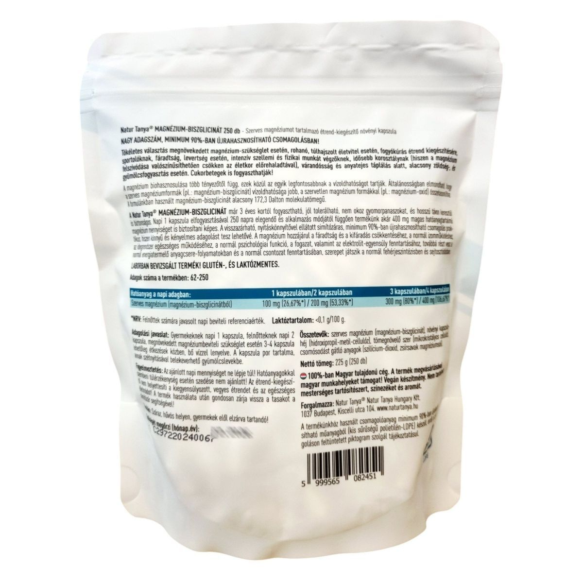 A Natur Tanya Magnézium-biszglicinát szerves, aminosav-kelát formában tartalmazza a magnéziumot, amely kiválóan hasznosuló és jól tolerálható forrás. A termék nagy adagolási számú (250 db kapszula), így hosszú távú kúrát tesz lehetővé. A magnézium hozzájárulhat az idegrendszer és az izomzat normál működéséhez, az elektrolit-egyensúly fenntartásához, valamint a fehérjeszintézis és sejtosztódás normál folyamatához. A vegán kapszulában lévő, magas biológiai hasznosulású magnézium-biszglicinát jól felszívódik, nem terheli a gyomrot, és alkalmas a mindennapi magnézium-pótlásra. A csomagolás minimum 90%-ban újrahasznosítható, a termék nem tartalmaz mesterséges tartósítószert, színezéket vagy aromát, 100%-ban magyar tulajdonú cég fejlesztése.
