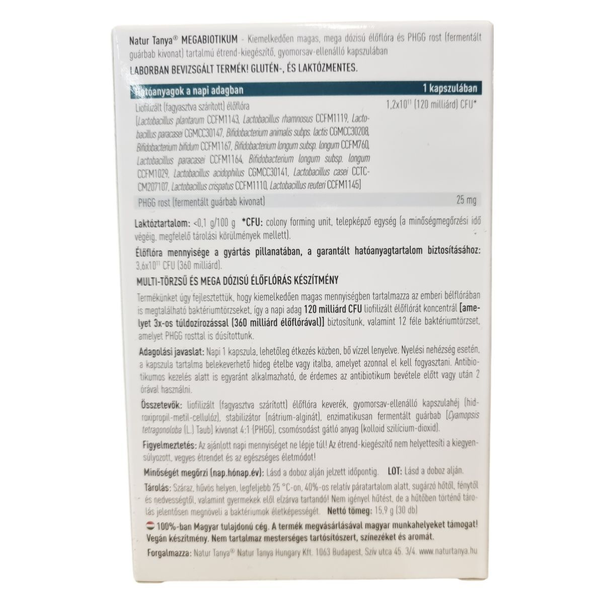 A Natur Tanya® Megabiotikum egy laborban bevizsgált étrend-kiegészítő, amely 12 különböző, az emberi bélflórában is megtalálható baktériumtörzset tartalmaz, összesen 120 milliárd CFU élőflóra mennyiségben. A termék különlegessége a gyomorsav-ellenálló kapszula, mely megóvja a hatóanyagokat a gyomorsav negatív hatásától, így biztosítva azok megfelelő célba jutását. Az élőflórát fermentált guárbab kivonatból készült PHGG rost egészíti ki, amely hozzájárulhat a bélrendszer egészségének támogatásához. A készítmény glutén- és laktózmentes, nem tartalmaz mesterséges tartósítószert, színezéket és aromát, valamint teljes mértékben vegán. A termék magyar tulajdonú cég gyártása, támogatva ezáltal a hazai munkahelyeket. A napi adagolás során ajánlott a kapszulát étkezés közben bő folyadékkal bevenni, viszont nyelési nehézség esetén a kapszula tartalma elvehető hideg ételbe vagy italba. Antibiotikumos kezelés alatt is beilleszthető az étrendbe, megfelelő időköz megtartásával az antibiotikum bevétele mellett.