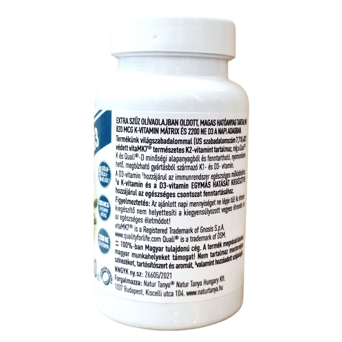 A Natur Tanya® OLIVA K2+D3 egy prémium minőségű étrend-kiegészítő, amely természetes K2-vitamint (vitaMK7®), K1-vitamint (Quali®-K) és D3-vitamint (Quali®-D) tartalmaz extra szűz olívaolajban oldva. A termék világszabadalommal védett K2-vitamint tartalmaz, továbbá fenntartható, nyomonkövethető gyártásból származó, megbízható alapanyagokat használ. A benne lévő D3-vitamin hozzájárulhat az immunrendszer egészséges működéséhez, míg a K- és D3-vitamin együttes hatásuk révén támogathatják az egészséges csontozat fenntartását. A készítmény nem tartalmaz mesterséges színezéket, tartósítószert és aromát, valamint hozzáadott szójaolajat sem. Magyar tulajdonú cég terméke, mely megvásárlásával hazai munkahelyeket támogat.