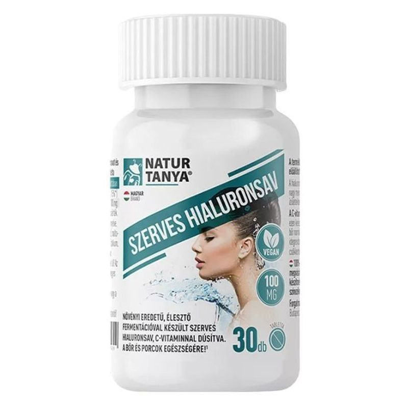 A Natur Tanya hialuronsav tabletta; 100 mg aktív, fermentált hialuronsavat tartalmaz adagonként, ezzel járulva hozzá a szervezetben lévő hialuronsav mennyiségének pótlásához.