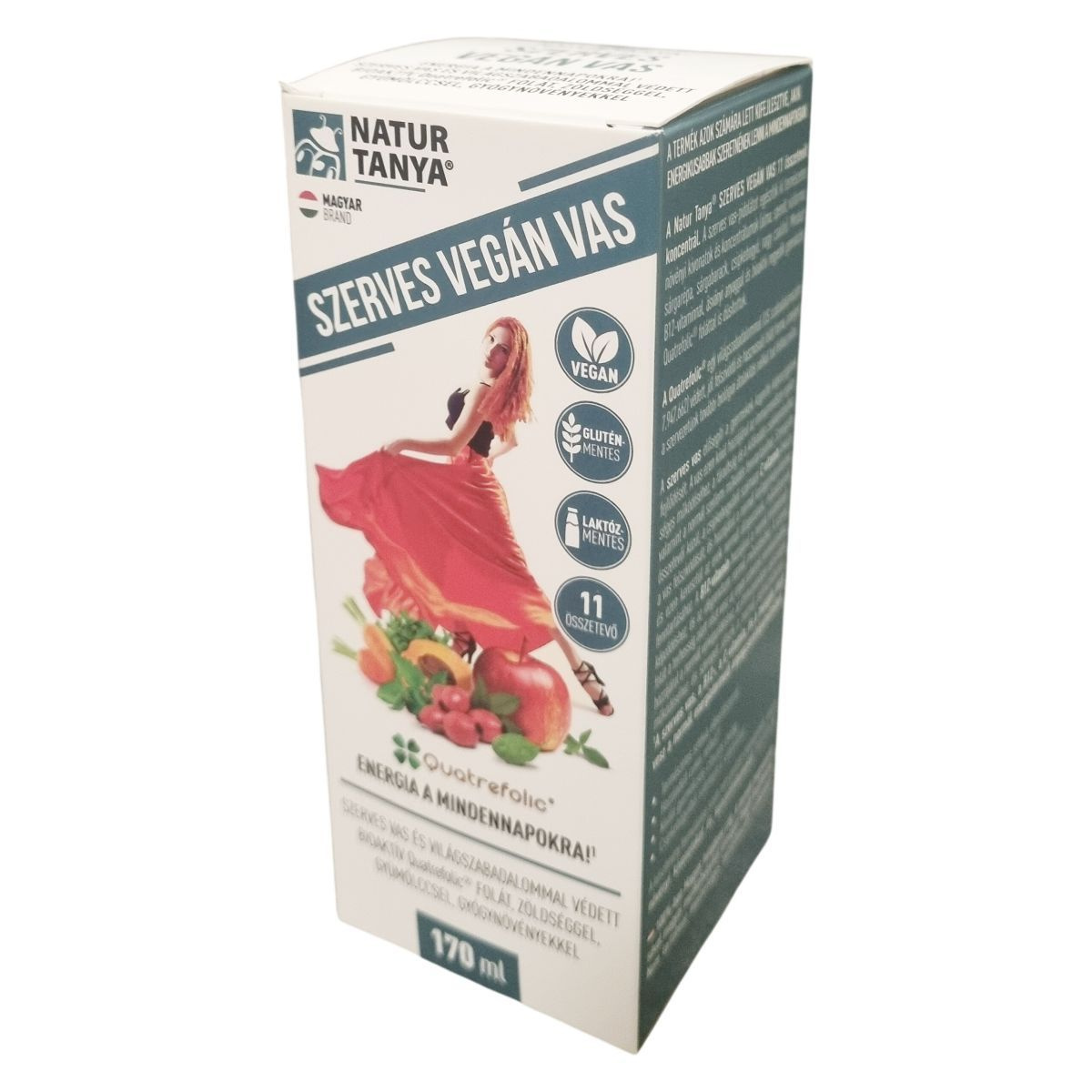 A Natur Tanya® Szerves Vegán Vas egy laboratóriumban bevizsgált étrend-kiegészítő, amely 11 természetes összetevőt koncentrál, köztük szerves vas-pidolátot és a világszabadalommal védett Quatrefolic® bioaktív folátot. A termék természetes növényi kivonatokat és koncentrátumokat tartalmaz alma, spenót, vízitorma, sárgarépa, sárgabarack, csipkebogyó és nagy csalán felhasználásával. Kiemelten fontos benne a B12-vitamin és a csipkebogyóból származó C-vitamin, amelyek hozzájárulhatnak a normál vörösvérsejt-képződéshez, az immunrendszer egészséges működéséhez, a fáradtság csökkentéséhez, valamint a kollagénképződés és az érrendszer normál működésének fenntartásához. A Quatrefolic® folát jól felszívódó, további biológiai átalakítás nélkül hasznosuló forma, amely részt vesz az energiatermelő anyagcserefolyamatokban. A készítmény természetes sztévia édesítőszerrel készül, hozzáadott cukrot nem tartalmaz, és vegánok számára is alkalmas. A termék támogatja az energikus mindennapokat és a gyermekek kognitív képességeinek fejlődését, miközben egyaránt fontos szerepet játszhat a normál sejtosztódásban és vérképződésben.