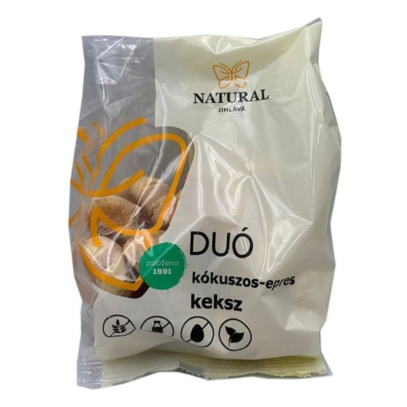 Közvetlen fogyasztásra alkalmas gluténmentes kókuszos epres keksz. 100% Plant-Based termék.