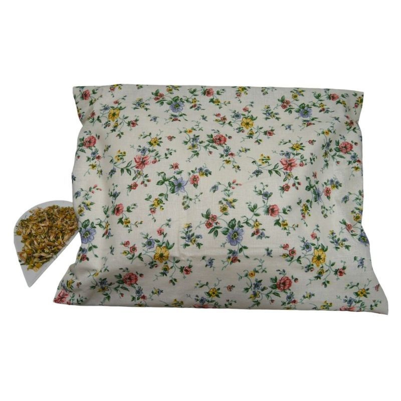 Töltet: 60% tönkölypelyva, 20% orvosi kamilla virág, 20% borsmenta. Belső huzat: vászon. Külső huzat: pamutvászon. Méret: 25*35cm.