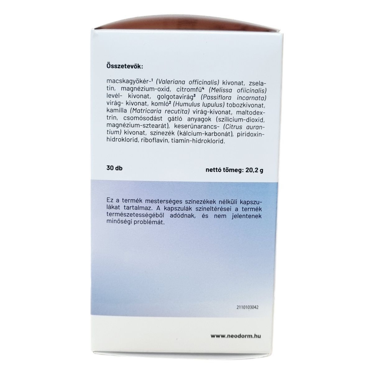 macskagyökér-kivonat, zselatin, magnézium-oxid, citromfű levél-kivonat, golgotavirág virág-kivonat, komló tobozkivonat, kamilla virág-kivonat, maltodextrin, szilícium-dioxid, magnézium-sztearát, keserűnarancs kivonat, kálcium-karbonát, piridoxin-hidroklorid, riboflavin, tiamin-hidroklorid