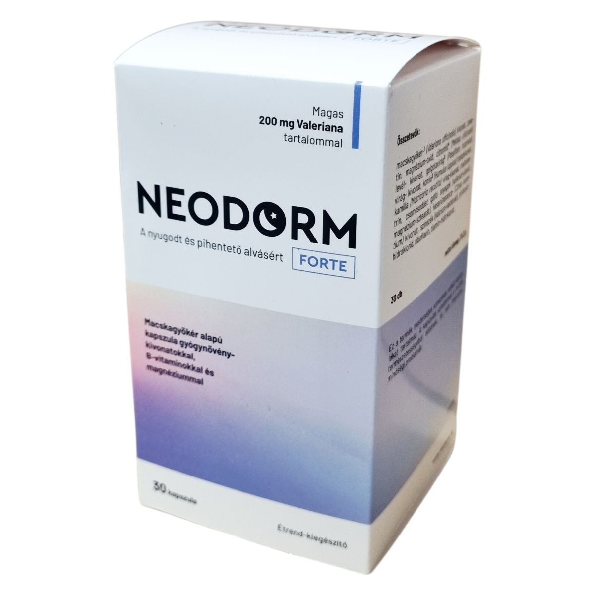 A NEODORM FORTE egy macskagyökér alapú étrend-kiegészítő kapszula, mely többféle gyógynövény-kivonatot, B-vitaminokat és magnéziumot tartalmaz. A készítmény összetevői között szerepel a macskagyökér, citromfű, golgotavirág, komló, kamilla és keserűnarancs kivonata, melyek elősegíthetik a nyugodt és pihentető alvást. A B1-, B2- és B6-vitaminok, valamint a magnézium hozzájárulhatnak az idegrendszer normál működéséhez. A kapszulák mesterséges színezékek nélkül készülnek, természetes színük előfordulhat és nem jelenti minőségi hibát. Fontos, hogy a készítményt ne lépjük túl az ajánlott mennyiségben, és figyeljünk az esetleges kölcsönhatásokra más idegrendszeri készítményekkel. A termék nem helyettesíti a kiegyensúlyozott étrendet és az egészséges életmódot, továbbá nem ajánlott gyermekeknek, terhes és szoptató anyáknak. A használat során ajánlott fokozott óvatosság járművezetéskor.
