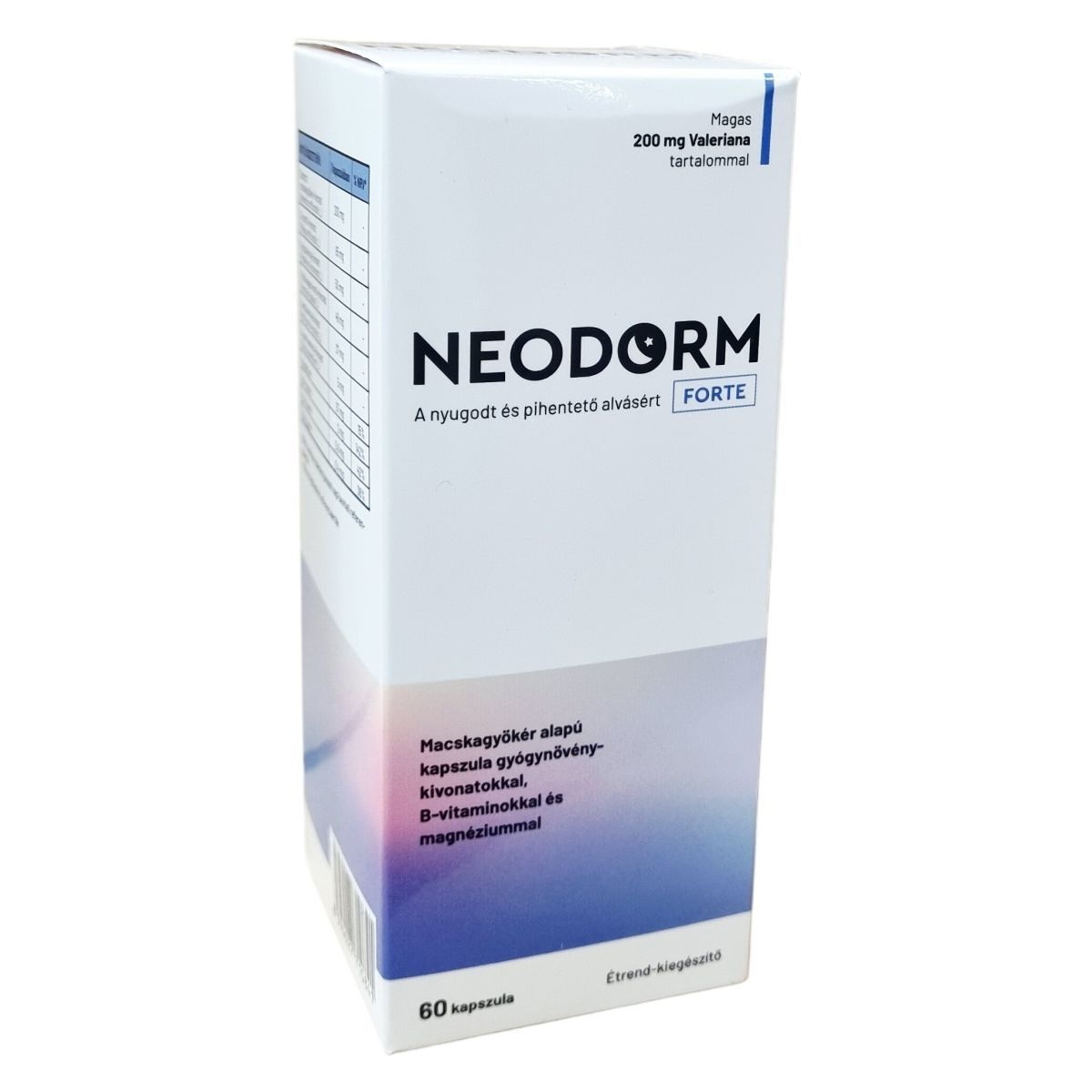 A NEODORM FORTE étrend-kiegészítő macskagyökér alapú kapszula, mely gyógynövény-kivonatokat, B-vitaminokat és magnéziumot tartalmaz. Összetevői között szerepel a macskagyökér, citromfű, golgotavirág, komló, kamillavirág és keserűnarancs kivonata, melyek hozzájárulhatnak a nyugodt, pihentető alváshoz. A B1-, B2- és B6-vitaminok, valamint a magnézium támogatják az idegrendszer normál működését. Az ajánlott adagolás 1 kapszula fél órával lefekvés előtt, javasolt a 2-3 hónapos folyamatos szedés. A készítmény fogyasztása nem helyettesíti a vegyes étrendet és az egészséges életmódot. Óvatosan alkalmazandó más, idegrendszerre ható szerekkel együtt, mert fokozhatja azok hatását. A termék gyermekek, terhes és szoptató anyák számára nem ajánlott. Tárolása során fontos a száraz, sötét hely és a megfelelő hőmérséklet betartása. Az üres doboz a háztartási szemétbe dobható.