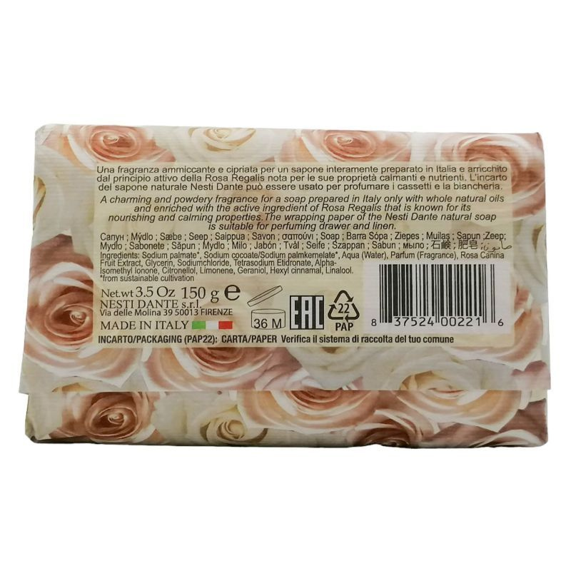 Sodium palmate, Sodium cocoate, Sodium palmkernelate, Aqua, Parfum, Rosa Canina Fruit Extract, Glycerin, Sodium Chloride, Tetrasodium etidronate, Pentasodium Pentetate, Alpha Isomethyl Ionone, Benzyl Salicylate, Hexyl Cinnamal, Hydroxycitronellal .