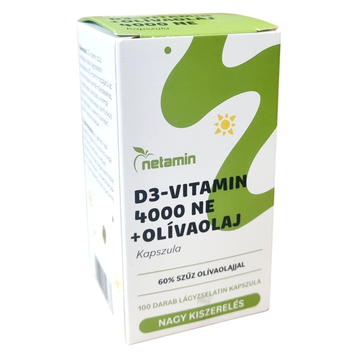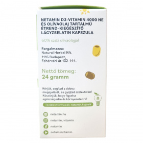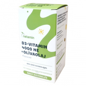A netamin D3-vitamin 4000 NE + olívaolaj étrend-kiegészítő lágyzselatin kapszula 60% szűz olívaolajjal készül, és nagy kiszerelésben, 100 darabos csomagolásban érhető el. A termék nettó tömege 24 gramm. A csomagolás környezetbarát, és arra kérik a vásárlókat, hogy a dobozt szelektíven gyűjtsék, ezzel is támogatva a fenntarthatóságot. A termékhez további információk elérhetőek a netamin hivatalos honlapján és közösségi média felületein.