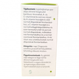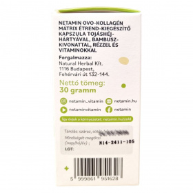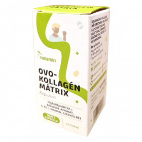 A Netamin OVO-KOLLAGÉN MÁTRIX kapszula egy speciális étrend-kiegészítő, amely tojáshéjhártya-por, bambusz-kivonat, A- és C-vitamin, valamint szerves réz kombinációját tartalmazza. Az A-vitamin hozzájárulhat a bőr normál állapotának fenntartásához, míg a C-vitamin támogathatja a normál kollagénképződést, ami fontos lehet a bőr, porcok és csontozat egészsége szempontjából. A réz részt vehet a kötőszövetek normál állapotának fenntartásában. A termék napi adagja 2 kapszula, amelyet bő folyadékkal, lehetőleg étkezés közben ajánlott bevenni. A termék forgalmazója a Natural Herbal Kft., és a kapszulák 60 darabos kiszerelésben kaphatók.