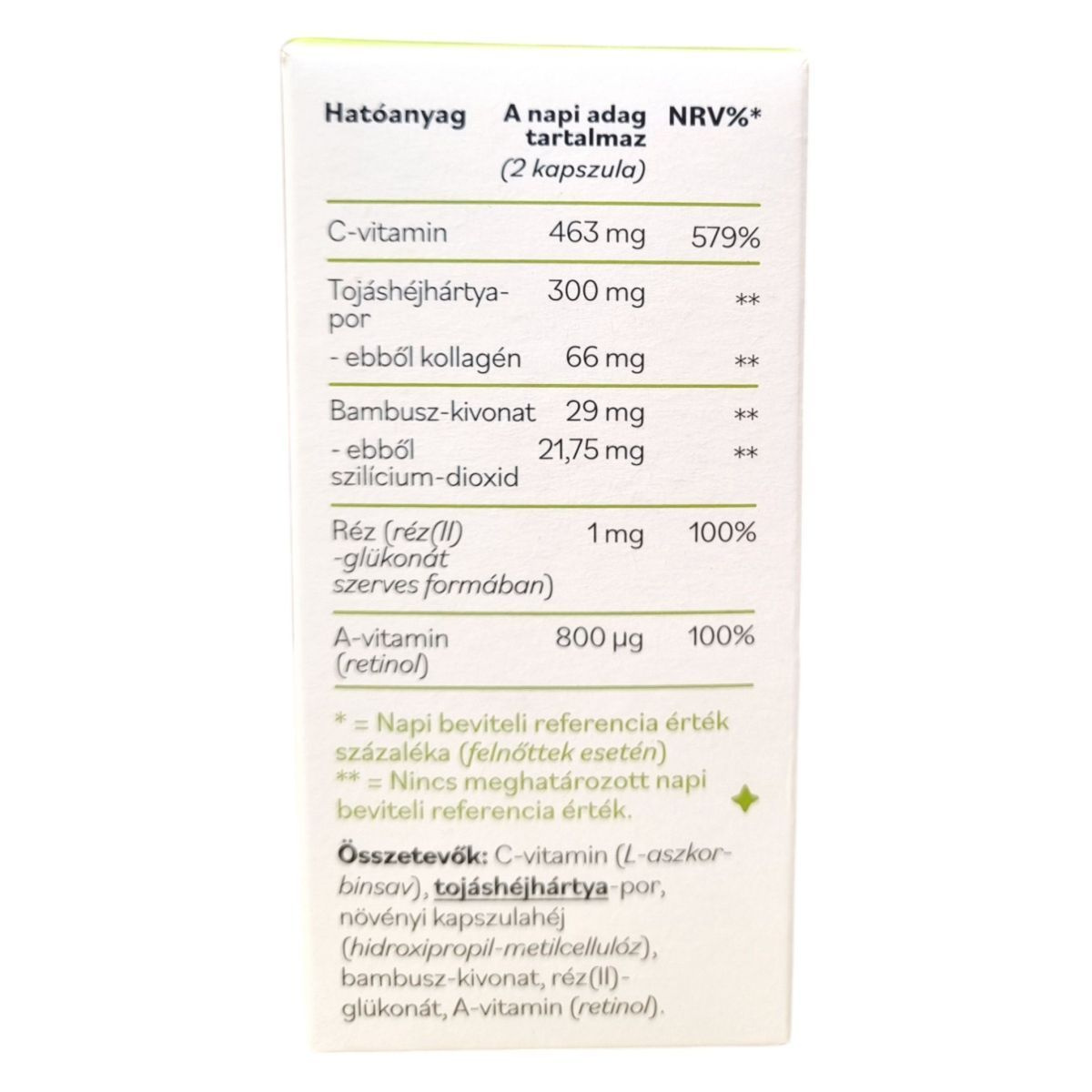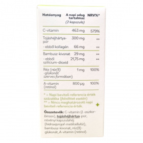 C-vitamin (L-aszkorbinsav), tojáshéjhártya-por, növényi kapszulahéj (hidroxipropil-metilcellulóz), bambusz-kivonat, réz(II)-glükonát, A-vitamin (retinol).
