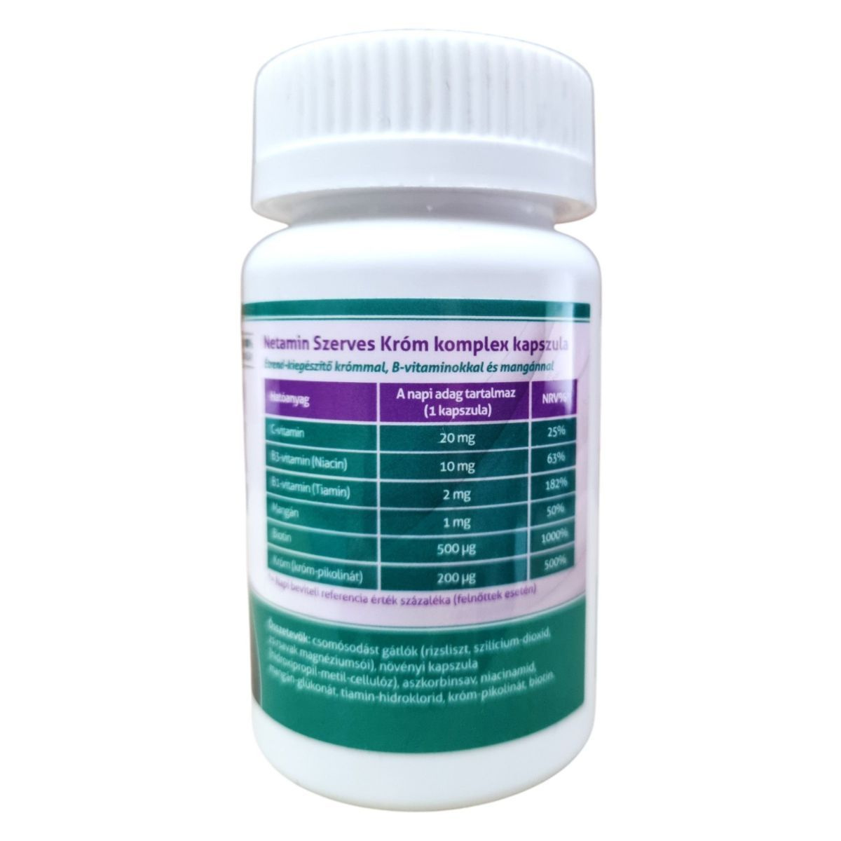 Csomósodást gátlók (rizsliszt, szilícium-dioxid, magnézium-sztearát), növényi kapszula (hidroxi-propil-metil-cellulóz), aszkorbinsav, niacinamid, mangán-glükonát, tiamin-hidroklorid, króm-pikolinát, biotin.