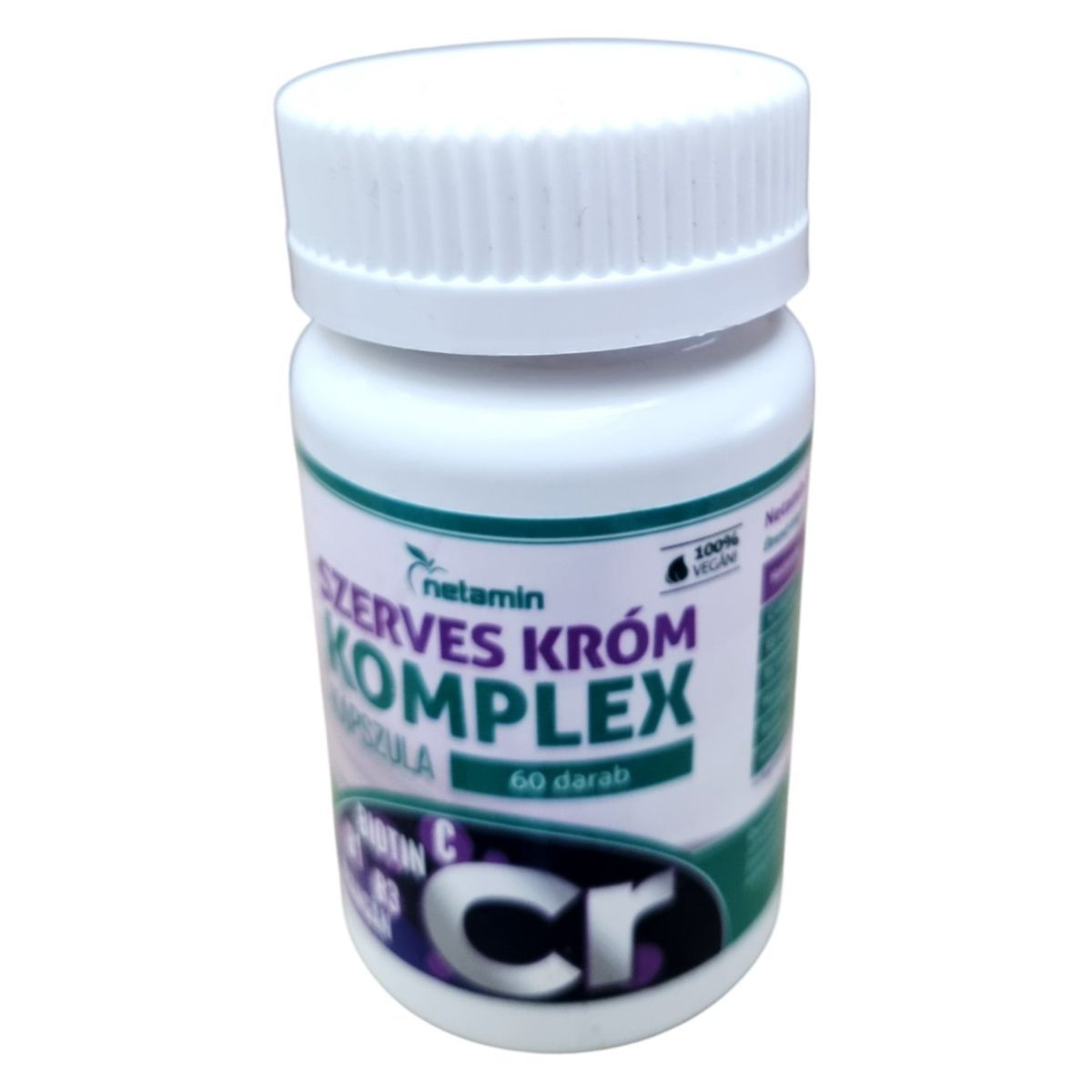A Netamin Szerves Króm komplex kapszula egy étrend-kiegészítő, amely krómot, B-vitaminokat és mangánt tartalmaz. A króm hozzájárulhat a normál vércukorszint fenntartásához, míg a mangán, a biotin, a B1- és B3-vitaminok részt vehetnek a normál energiatermelő anyagcsere-folyamatokban. A kapszulákban látható piros szemcsék természetesek, a króm-pikolinát jelenléte okozza őket. A termék bio étrendi irányzatba illeszkedik, és fontos, hogy az ajánlott napi adagot ne lépjük túl. A termék nem helyettesíti a kiegyensúlyozott étrendet és az egészséges életmódot.
