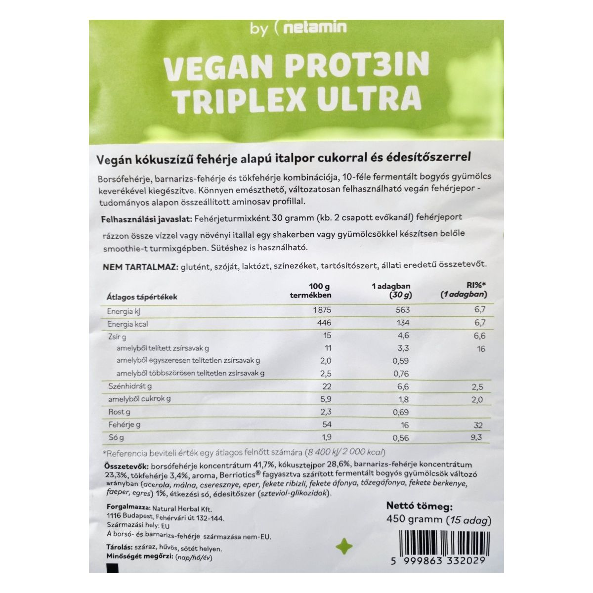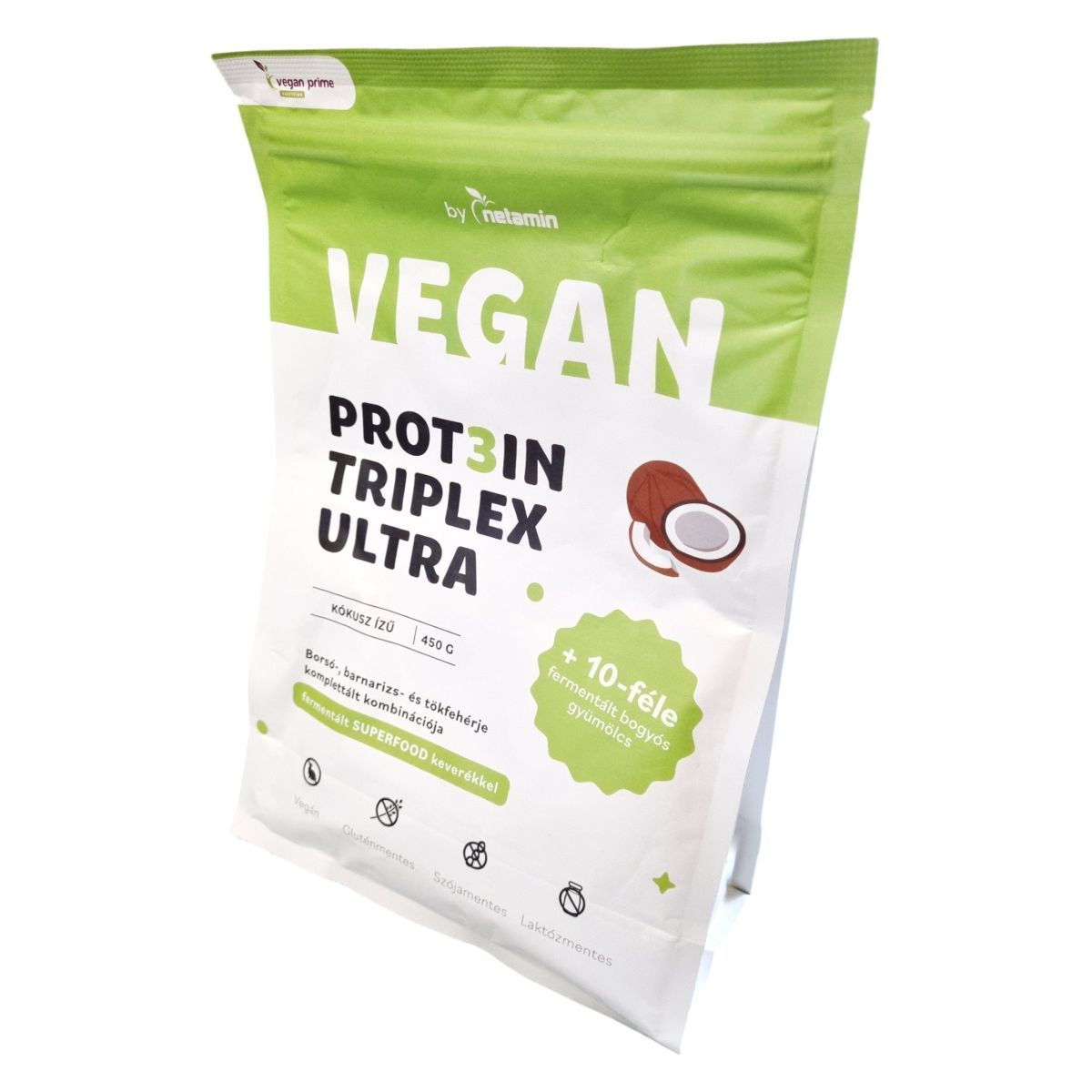 A Netamin VEGAN PROT3IN TRIPLEX ULTRA egy kókuszízű vegán fehérje alapú italpor, amely borsó-, barnarizs- és tökfehérje kombinációját tartalmazza, kiegészítve 10-féle fermentált bogyós gyümölcs keverékével. A termék könnyen emészthető és változatosan felhasználható, például turmixokhoz vagy sütéshez. A termék nem tartalmaz glutént, szóját, laktózt, színezéket, tartósítószert és állati eredetű összetevőt, így különösen alkalmas vegán étrendet követők számára. A termék 450 grammos kiszerelésben kapható, amely 15 adagot tartalmaz.