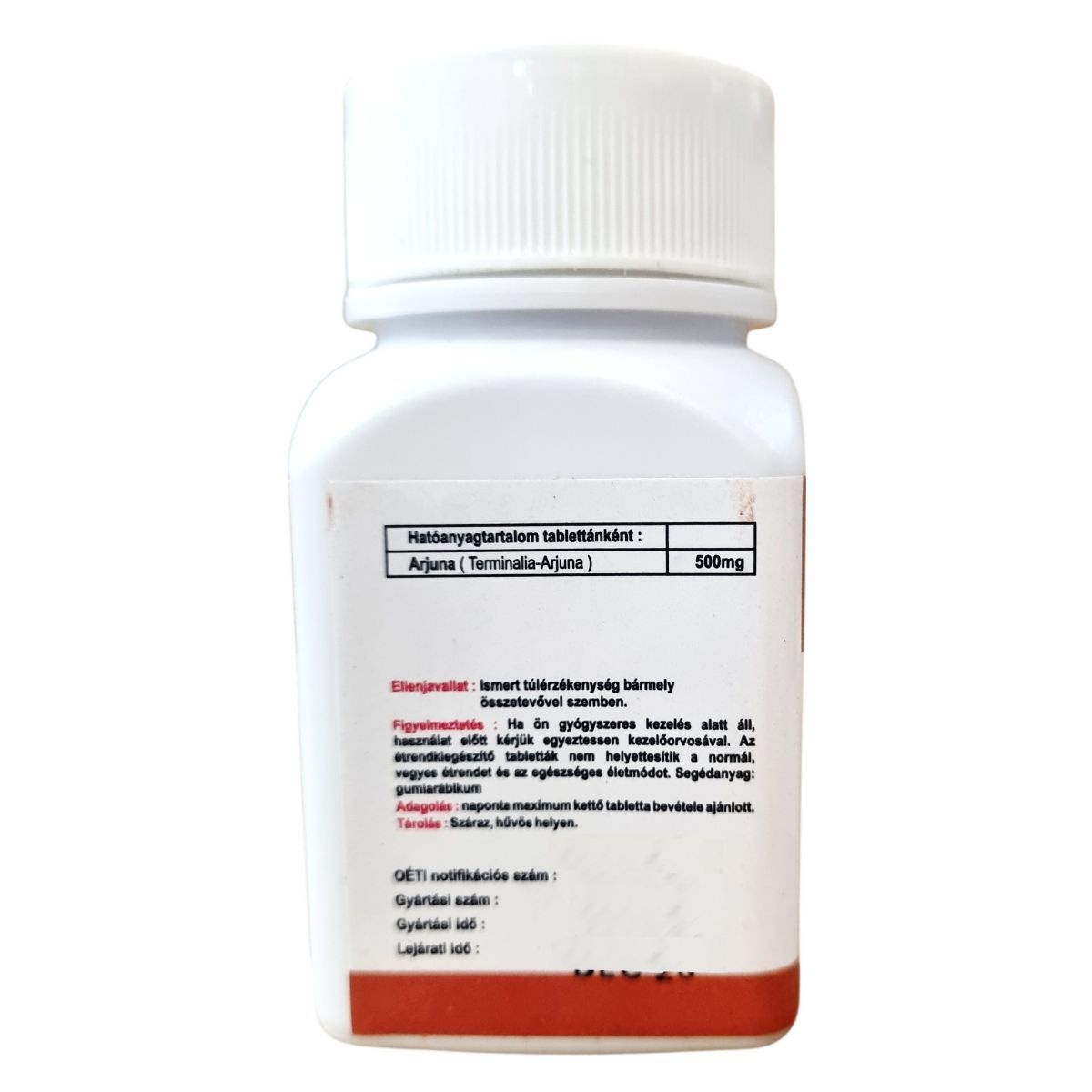 Az Arjuna tabletta Indiában készül, a SHRIJI HERBAL PRODUCTS gyártmánya, mely a Terminalia Arjuna nevű növényi kivonatot tartalmazza 500 mg mennyiségben tablettánként. A terméket a Neuston Healthcare Kft. forgalmazza Magyarországon. A tabletta segédanyaga gumiarábikum. A termék használata előtt javasolt szakemberrel konzultálni, különösen gyógyszeres kezelés esetén. A készítmény nem helyettesítheti a kiegyensúlyozott étrendet és az egészséges életmódot. Az adagolás napi maximum két tabletta bevételét ajánlja. A termék 100 darabos kiszerelésben kapható.