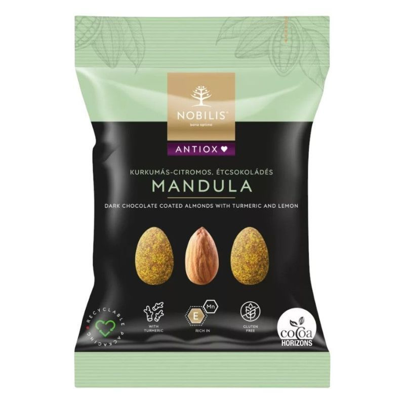 Finoman pörkölt mandula, 100%-ig fenntartható forrásból származó kakaóbabból készült belga étcsokoládéba mártva, szicíliai citromolajjal és kurkumával.