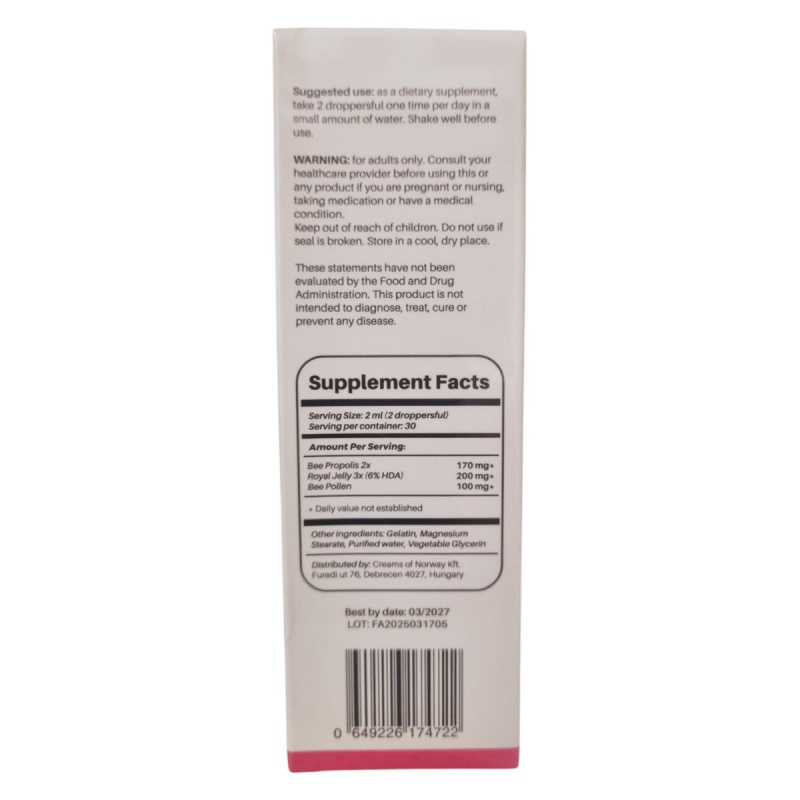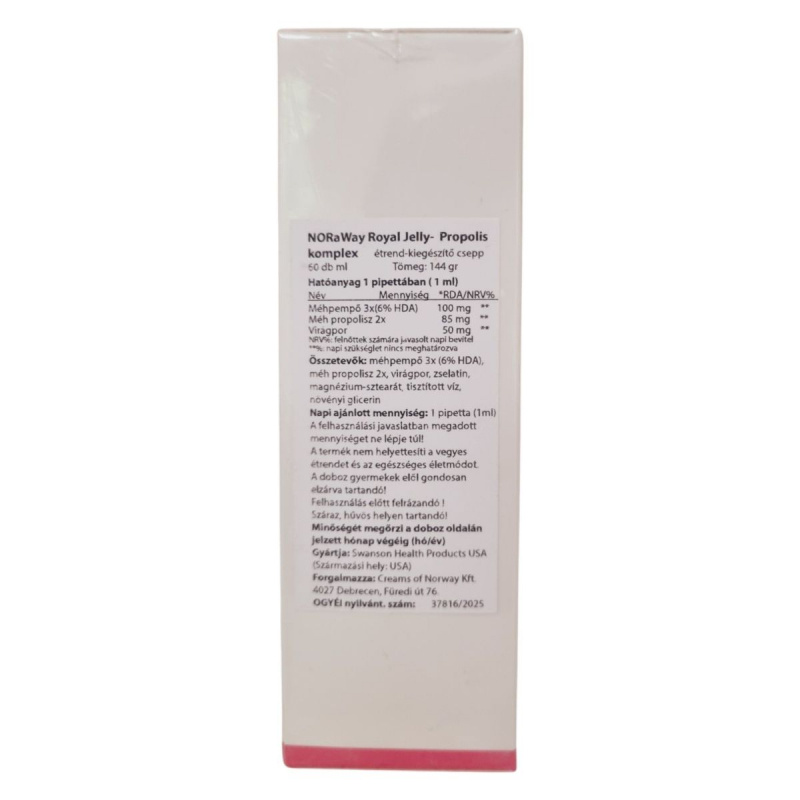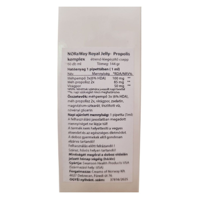 A NORaWAY Royal Jelly Propolis COMPLEX egy különleges étrend-kiegészítő, amely három fő összetevőt tartalmaz: méhpempőt, méh propoliszt és virágport. Ezek az összetevők együttesen támogathatják az immunrendszer működését. A termék 60 ml-es kiszerelésben kapható, és napi egy pipetta (1 ml) fogyasztása javasolt. A termék használata előtt alaposan fel kell rázni, és a megadott mennyiséget nem szabad túllépni. A termék nem helyettesíti a vegyes étrendet és az egészséges életmódot. A Creams of Norway Kft. forgalmazza, és az OGYÉI engedélyszáma 37816/2025.