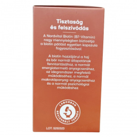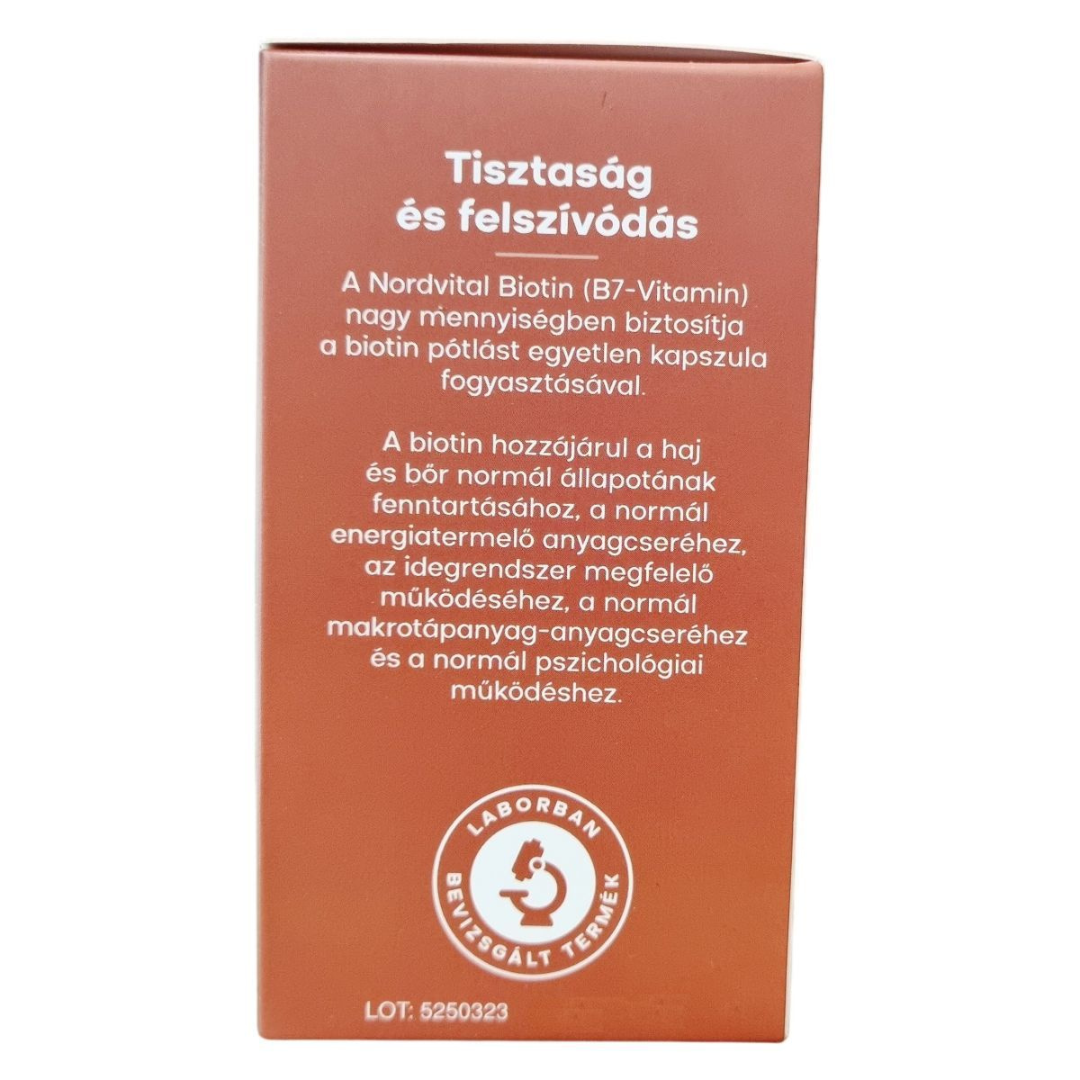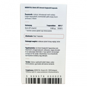 A Nordvital Biotin (B7-vitamin) kapszula 5000 µg biotint tartalmaz kapszulánként, támogatva a biotin pótlását. A kapszula vegán összetételű, rizslisztből és hidroxipropil-metil-cellulózból készül, a csomósodás gátlására leucin aminosavat tartalmaz. A termék 60 napi adagot biztosít 24 g nettó tömeggel. Az étrend-kiegészítő laktóz-, allergén-, glutén- és GMO-mentes, valamint GMP-minősítéssel rendelkező gyártóüzemben készül, amely megfelel a hatósági előírásoknak. A termék célja a normál bőr- és hajállapot fenntartásának, valamint az energia- és makrotápanyag-anyagcsere, az idegrendszer és a pszichológiai működés támogatása a megfelelő biotin ellátás biztosításával.