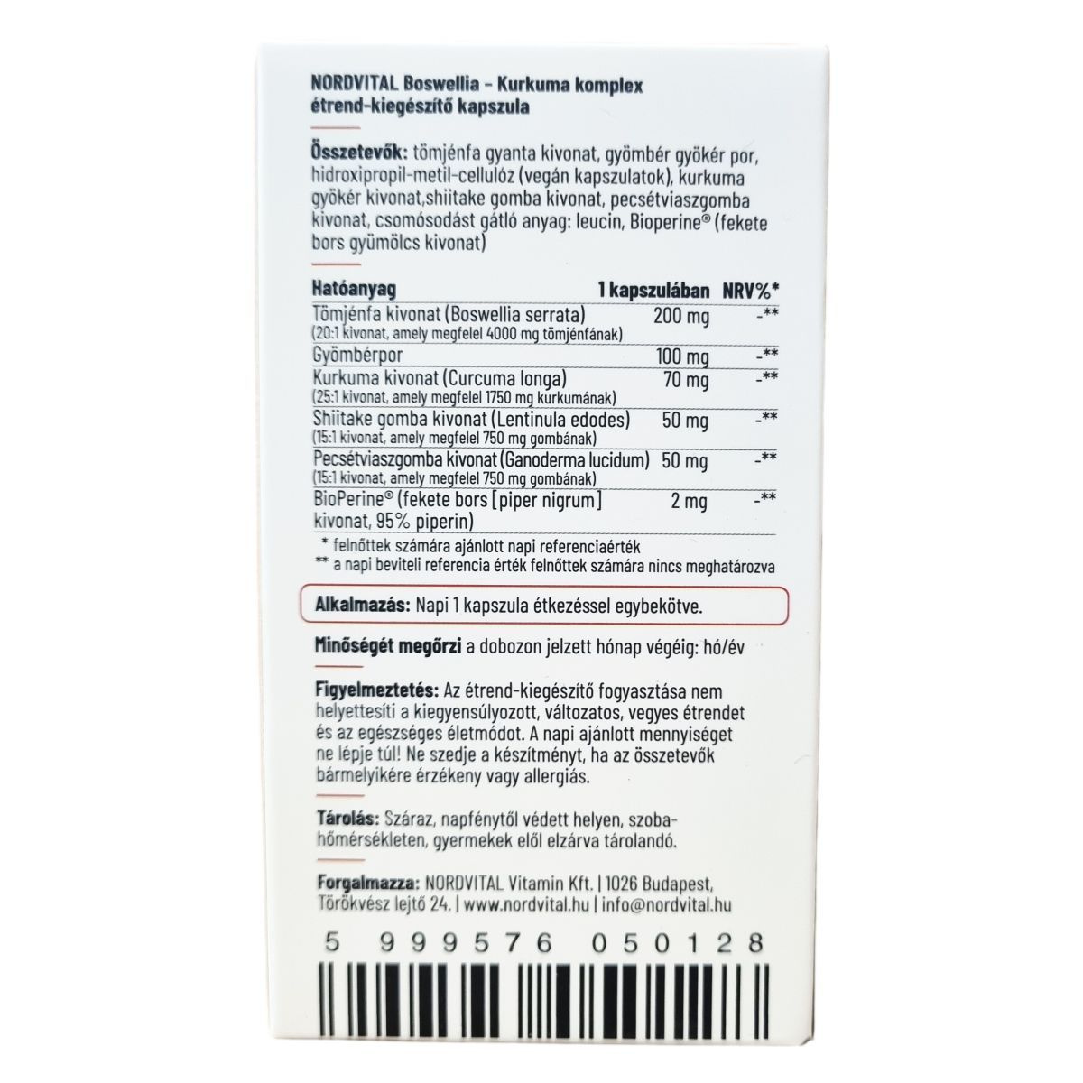 A NORDVITAL Boswellia - Kurkuma komplex étrend-kiegészítő speciális formulán alapul, amely természetes gyógynövényekből készül. A Boswellia hozzájárulhat a csontok és az ízületek egészségéhez, a fekete bors jelentős antioxidáns tulajdonságokkal rendelkezik, míg a gyömbér segítheti a gyulladásos folyamatok kezelését. A termék GMP minősített gyártóüzemben készül, laktóz-, allergén-, glutén-, GMO-mentes, és vegán étrendbe is beilleszthető kapszula formában érhető el. Tartalmaz shiitake és pecsétviaszgomba kivonatokat is, amelyek hozzájárulhatnak a szervezet támogatásához. A termék kapszulái hidroxipropil-metil-cellulóz alapúak, így megfelelnek a vegán életmód követelményeinek.