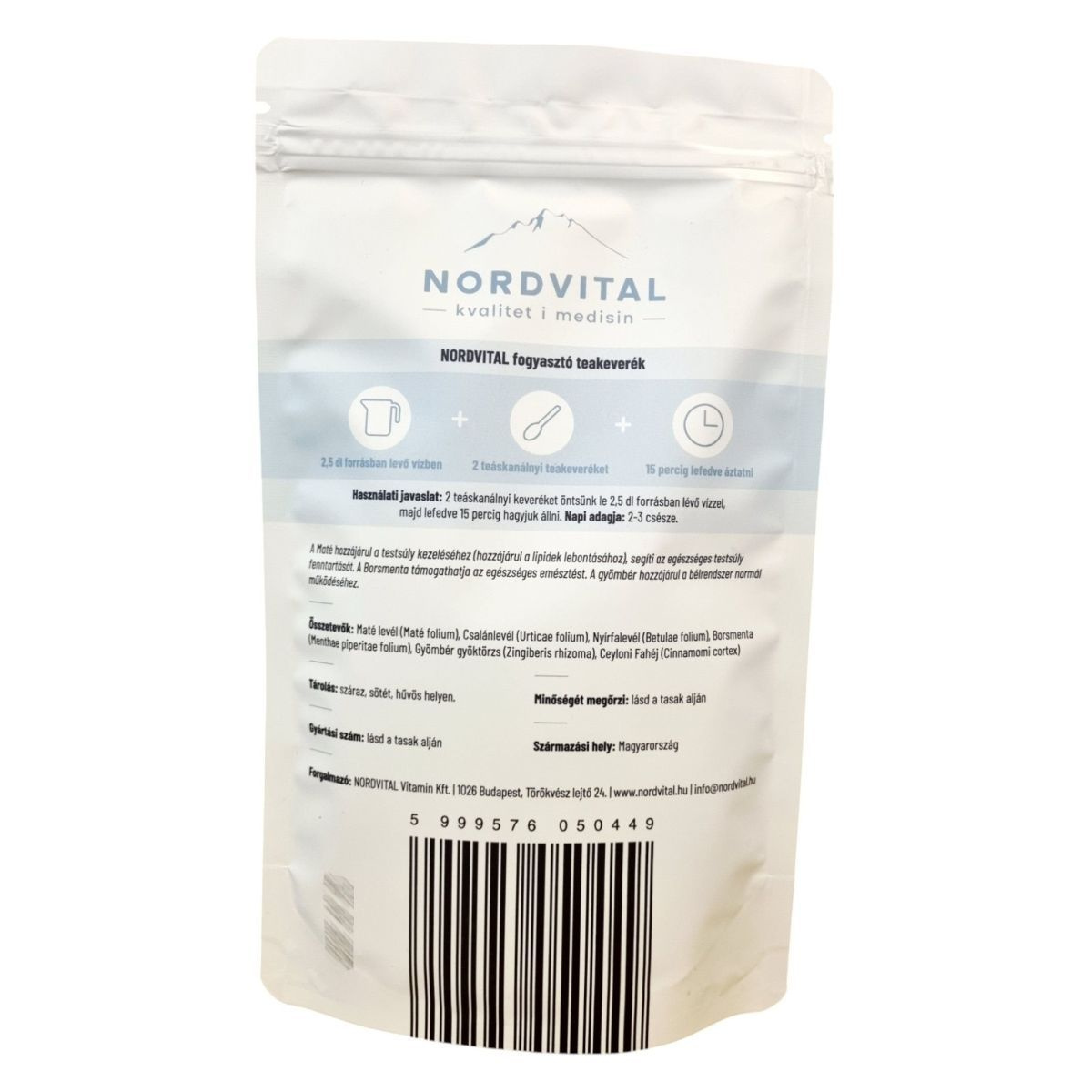A NORDVITAL fogyasztó teakeverék egy 100% natúr gyógynövényekből készült termék, amely segíthet a testsúly kezelésében és az egészséges emésztés támogatásában. A termék fő összetevői között megtalálható a Maté levél, amely hozzájárulhat a lipidek lebontásához, a Borsmenta, amely támogathatja az emésztést, valamint a Gyömbér, amely hozzájárulhat a bélrendszer normál működéséhez. A teakeverék használata egyszerű: 2 teáskanálnyi keveréket kell 2,5 dl forrásban lévő vízbe áztatni 15 percig. A termék Magyarországon készül, és a NORDVITAL Vitamin Kft. forgalmazza.