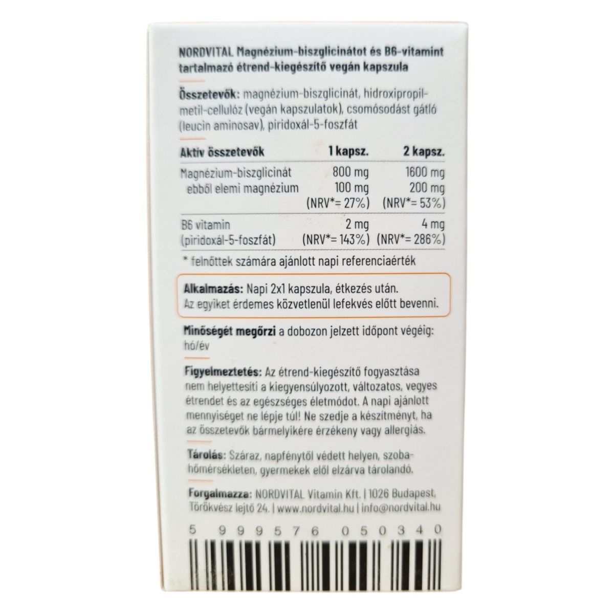 A NORDVITAL Magnézium-biszglicinát és B6-vitamin étrend-kiegészítő vegán kapszula formájában érhető el, amely szerves, kelát kötésű magnézium-biszglicinátot tartalmaz. A termék B6-vitaminnal, piridoxál-5-foszfát formájában van kiegészítve, ami segíthet a magnézium jobb hasznosulásában. A kapszulák laborban bevizsgáltak, és a termék GMP minősített gyártóüzemben készült. A termék tisztasága és felszívódása kiemelkedő lehet, és még a kényes gyomrúaknál sem okozhat laza székletet.