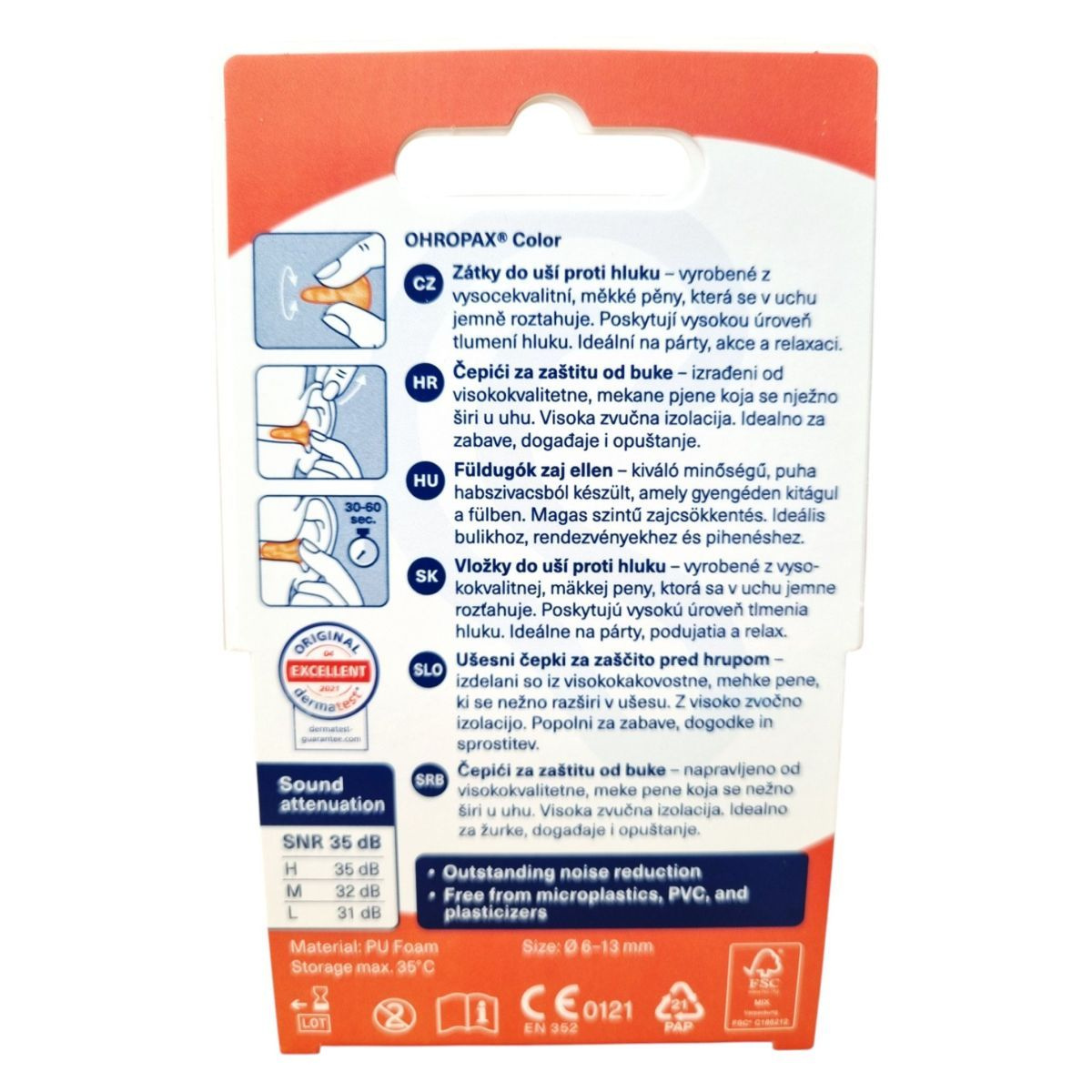 Az OHROPAX Color füldugók kiváló minőségű, puha habanyagból készültek, amelyek gyengéden kitágulnak a fülben, így magas szintű zajcsökkentést biztosíthatnak. Az SNR 35 dB-es zajcsökkentési értékük révén hatékonyan csökkenthetik a környezeti zajokat, legyen szó bulikról, rendezvényekről vagy pihenésről. A termék mentes mikroplasztikoktól, PVC-től és lágyítóktól, így környezetbarát választás lehet. A füldugók tárolása maximum 35°C-on ajánlott.