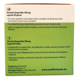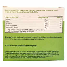 A Diosmin Hesperidin 500 mg kapszula diosmint, heszperidint, vadgesztenye kivonatot, vörösszőlőlevél kivonatot és inulint tartalmazó étrend-kiegészítő. A termék elősegítheti az erek falának erősítését és a normál vénás keringés fenntartását. Segíthet a nehézlábérzés csökkentésében, amely a visszerek megjelenése miatt alakulhat ki. Az inulin hozzájárulhat a vitaminok, ásványi anyagok és nyomelemek hatékonyabb felszívódásához. A kapszula napi adagja 2x1 darab, amelyet főétkezések előtt ajánlott bőséges folyadékkal lenyelni, szétrágás nélkül. A termék nem helyettesíti a kiegyensúlyozott étrendet és az egészséges életmódot, továbbá nem javasolt gyermekek, terhes és szoptatós nők számára.