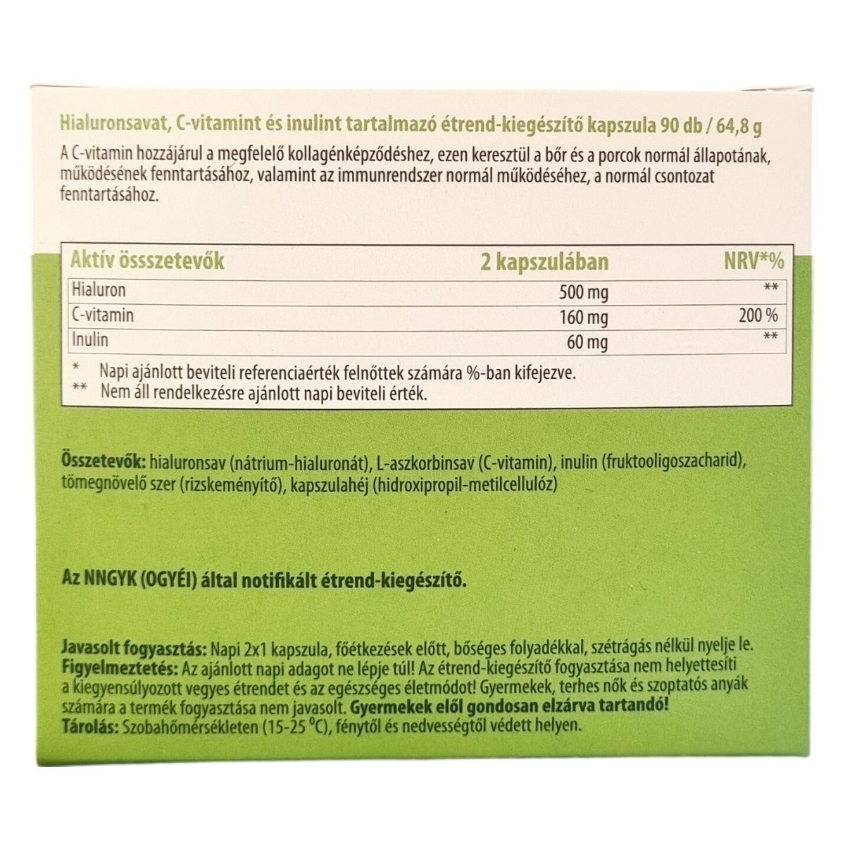 A Hyaluronic Forte 500 mg kapszula hialuronsavat, C-vitamint és inulint tartalmaz. A hialuronsav a bőr, kötőszövet, ízületi folyadék és porcszövet természetes alkotórésze, amely kiemelkedő képességgel rendelkezik nagy mennyiségű víz megkötésére. A C-vitamin hozzájárulhat a megfelelő kollagénképződéshez, támogatva ezzel a bőr és a porcok normál állapotát és működését, emellett az immunrendszer és a csontozat normál működésében is szerepet játszhat. Az inulin elősegítheti a vitaminok, ásványi anyagok és nyomelemek hatékonyabb hasznosulását. A termék kapszulában kerül forgalomba, és fogyasztása során fontos a megfelelő folyadékbevitel. Az érintettek kizárólag a csomagoláson jelzett mennyiséget fogyasszák, továbbá a termék nem helyettesíti a változatos étrendet és az egészséges életmódot.