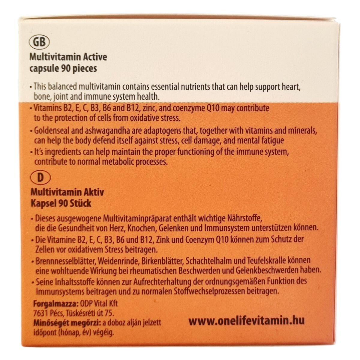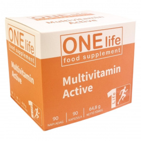 A ONE life Multivitamin Active kapszula olyan vitaminokat, ásványi anyagokat, nyomelemeket, koenzim Q10-et, valamint ashwagandha- és aranygyökér kivonatokat tartalmazó étrend-kiegészítő, amely hozzájárulhat az immunrendszer normál működéséhez, a mentális teljesítmény és szellemi frissesség fenntartásához, továbbá támogatja a szív-, a csont-, az ízületi- és az immunrendszer egészségét. A termék hatóanyagai között szerepelnek az A-, B-, C-, D-, E- és K-vitaminok, a cink, vas, réz, szelén, jód, magnézium és króm, amelyek fontos szerepet játszanak a szervezet normál anyagcsere-folyamataiban és a sejtek oxidatív stressz elleni védelmében. Az adaptogén növényi összetevők, mint a goldenseal és ashwagandha, segíthetik a szervezet védekezőképességét a stressz, a sejtkárosodás és a mentális fáradtság ellen. A kapszulák napi egyszeri bevétele javasolt, a készítmény szedése mellett ajánlott a változatos és kiegyensúlyozott étrend, valamint az egészséges életmód fenntartása.