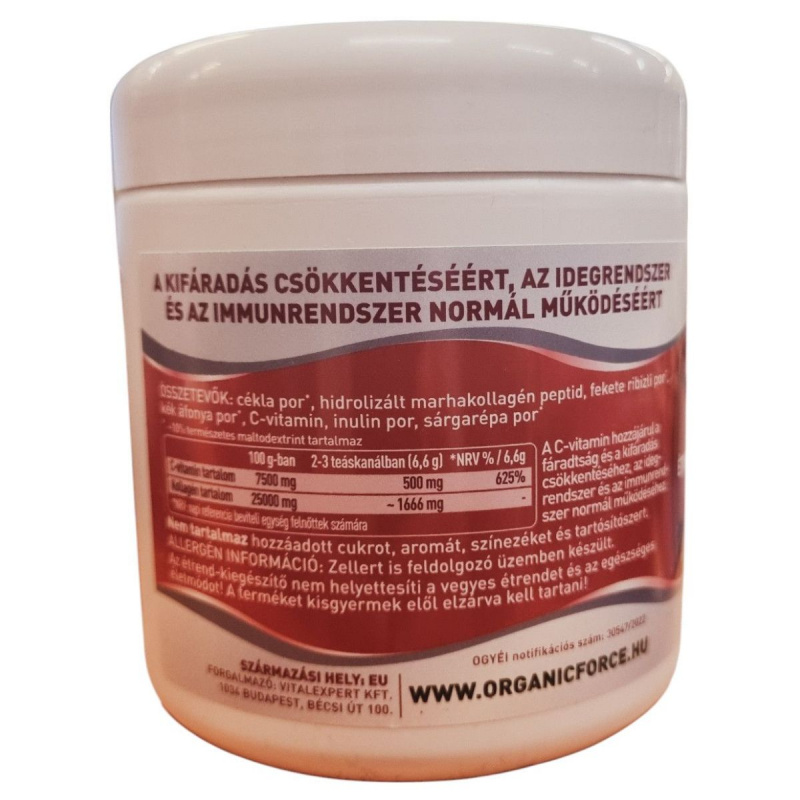 Összetevők: cékla por, hidrolizált marhakollagén peptid, fekete ribizli por, kék áfonya por, C-vitamin, inulin por, sárgarépa por, maltodextrin/kukoricakeményítő (csomósodást gátló).