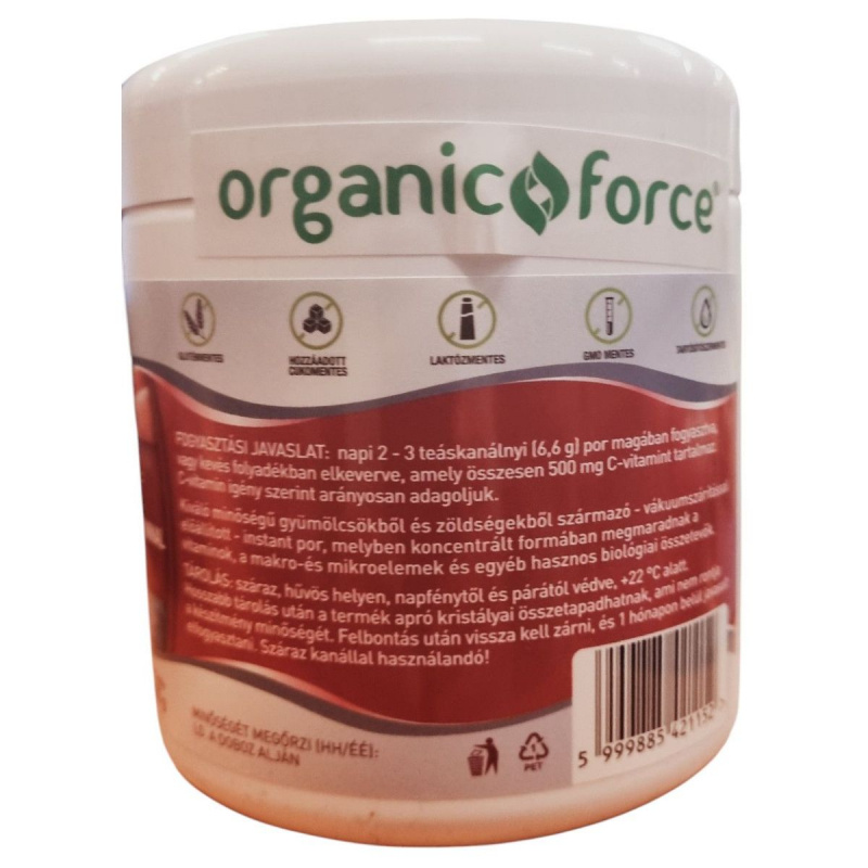 Magas flavonoid és antioxidáns tartalmú szuperkoncentrátum. Összetevői támogatják a fizikai és szellemi aktivitást. Cékla, fekete ribizli, kék áfonya, sárgarépa tartalmú. Napi javasolt adagban 500mg C vitaminnal + az összetevők természetes vitamintartalmával. Kollagén tartalommal a napi javasolt adagban 1660mg. Inulin összetevővel, amely prebiotikumként a bélflóra egyensúlyát támogatja. Instant por állagú szuperkoncentrátum, kanálról vagy kevés folyadékban elkeverve is jól fogyasztható. Pótold a napi C-vitamin adagod úgy, hogy közben természetes vitamintartalmú szuperkoncentrátummal erősíted az immunrendszered.