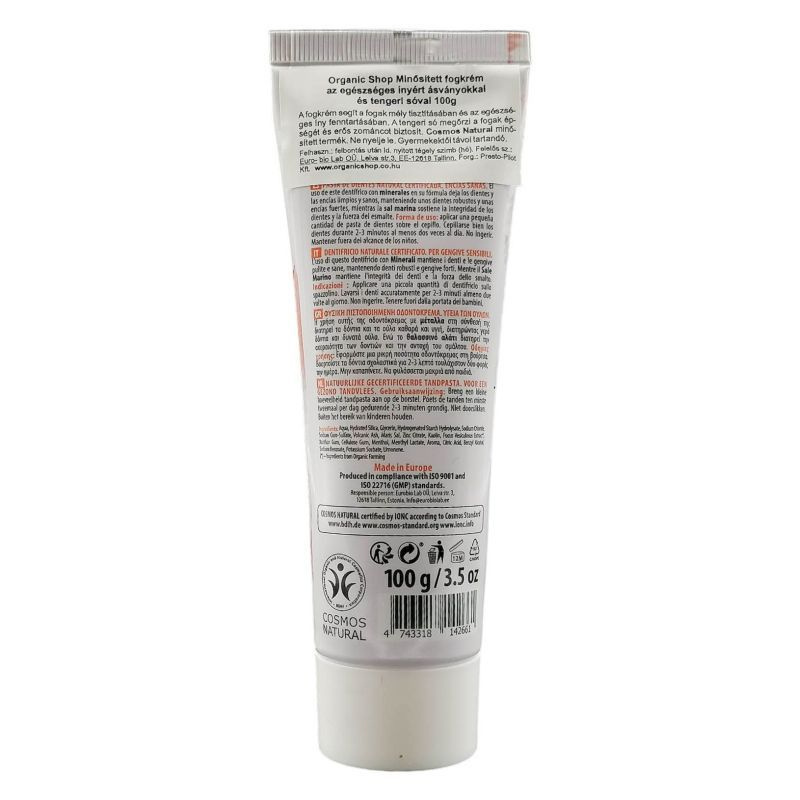 A tengeri só megőrzi a fogak épségét és erős zománcot biztosít. Cosmos Natural minősített termék. Ne nyelje le. Gyermekektől távol tartandó. Összetevők: Aqua, Hydrated Silica, Glycerin, Hydrogenated Starch Hydrolysate, Sodium Chloride, Sodium Coco-Sulfate, Volcanic Ash, Maris Sal, Zinc Citrate, Kaolin, Fucus Vesiculosus Extract*, Xanthan Gum, Cellulose Gum, Menthol, Menthyl Lactate, Aroma, Citric Acid, Benzyl Alcohol, Sodium Benzoate, Potassium Sorbate, Limonene.