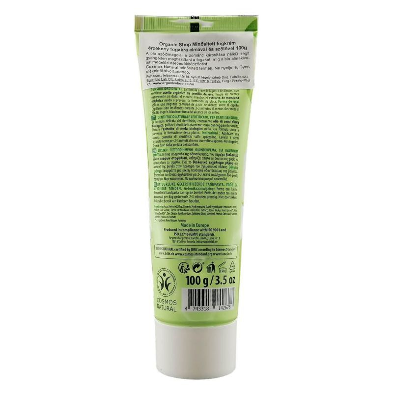 Cosmos Natural minősített termék. Ne nyelje le. Gyermekektől távol tartandó. Összetevők: Aqua, Hydrated Silica, Glycerin, Hydrogenated Starch Hydrolysate, Potassium Citrate, Sodium Coco-Sulfate, Stevia Rebaudiana Leaf/Stem Extract, Pyrus Malus Fruit Extract*, Vitis Vinifera Seed Oil*, Zinc Citrate, Xanthan Gum, Cellulose Gum, Menthol, Aroma, Citric Acid, Sodium Benzoate, Potassium Sorbate.