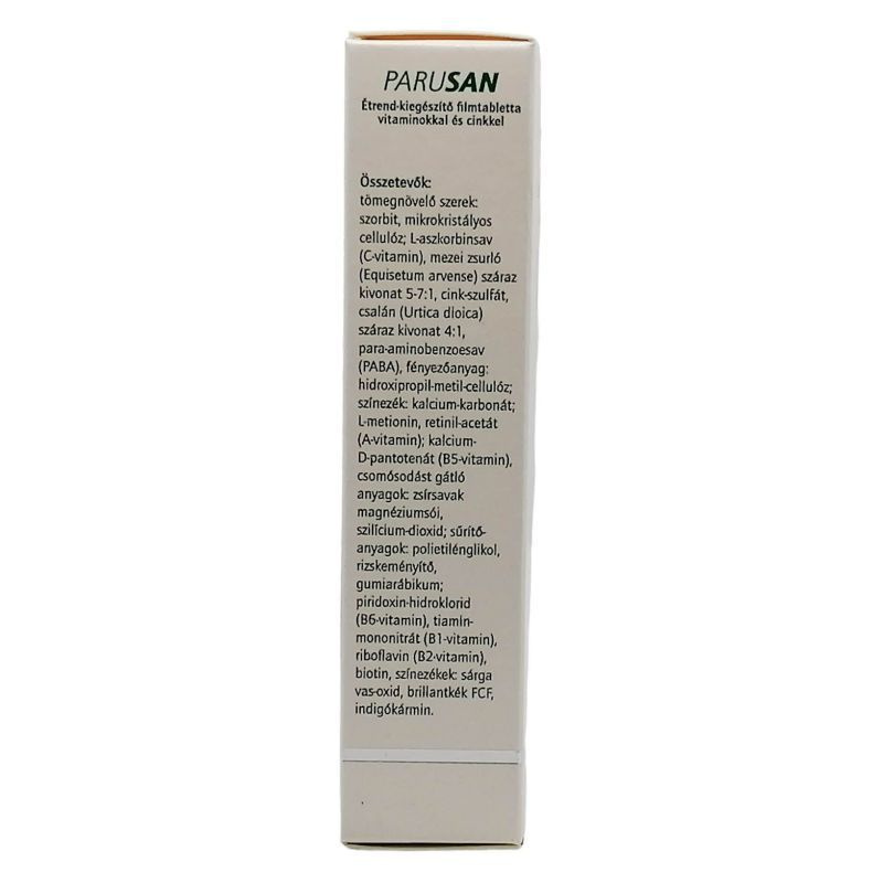 Összetevők: tömegnövelő szerek: szorbit, mikrokristályos cellulóz; L-aszkorbinsav (C-vitamin), mezei zsurló (Equisetum arvense) száraz kivonat 5-7:1, cink-szulfát, csalán (Urtica dioica) száraz kivonat 4:1, para-aminobenzoesav (PABA), fényezőanyag: hidroxipropil-metil-cellulóz; színezék: kalcium-karbonát; L-metionin, retinil-acetát (A-vitamin); kalcium- D-pantotenát (B5-vitamin), csomósodást gátló anyagok: zsírsavak magnéziumsói, szilícium-dioxid; sűrítőanyagok: polietilénglikol, rizskeményítő, gumiarábikum; piridoxinhidroklorid (B6-vitamin), tiamin-mononitrát (B1-vitamin), riboflavin (B2-vitamin), biotin, színezékek: sárga vas-oxid, brillantkék FCF, indigókármin.