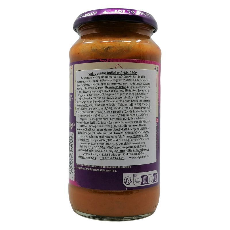 Vegetáriánusok fogyaszthatják! Gluténmentes! Nem tartalmaz mesterséges színezéket, aromát és tartósítószert. 4 adag, elkészítés 20 perc. Bevásárló lista: 400 g csicseriborsó és 2 db édesburgonya vagy 450 g csirkehús. Elkészítési javaslat: 1, Vágja föl a húst vagy zöldségeket és pirítsa meg (kb 5perc) 2, Adjuk hozzá a mártás és főzzük össze (kb 15perc) 3, Tálaljuk rizzsel vagy naan kenyérrel. Tálalás előtt adhat hozzá spenótot is. Összetevők: Víz, Paradicsom (10%), Tejszín (tej) (10%), Vaj (tej) (4%), Repceolaj, Cukor, Módosított Kukoricakeményítő, Paradicsom koncentrátum (2,5%), Szárított hagyma, Őrölt fűszerek (fűszerek, koriander (1,7%), kömény (1,4%)), Fokhagymapüré, Gyömbér püré, Só, Füstölt őrölt paprika (0,4%), Savak (tejsav, citromsav), Zöld kardamom (0,7%), Paprika kivonat, Szárított Görögszéna levél (0,3%). Allergéneket lásd az összetevőknél vastagon kiemelt betűkkel! Allergén: Dióféléket és földimogyorót tartalmazhat. Tárolás: Száraz, hűvös helyen. Felbontás után azonnal használja fel.